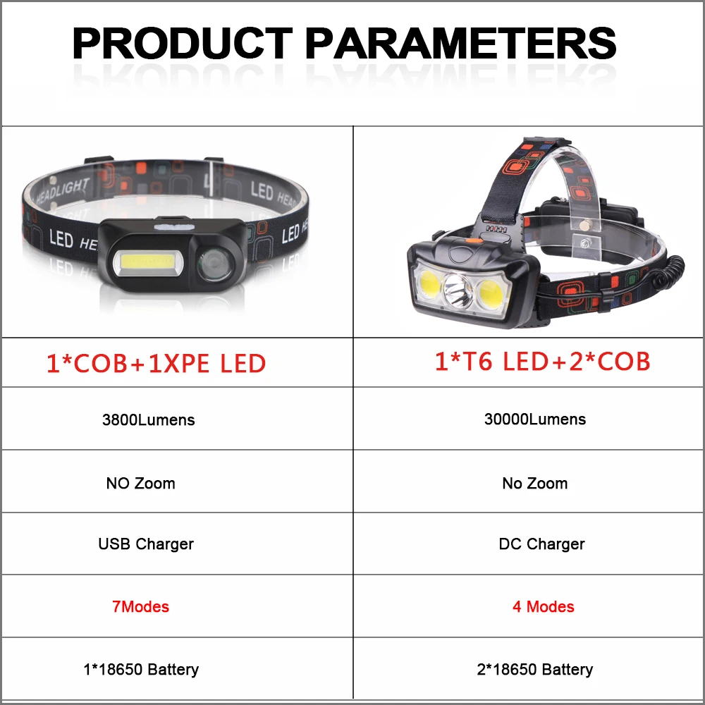 Супер яркие фары светодиодный T6 + COB головной светильник вспышки светильник фонарь светодиодный налобный фонарь головной светильник Применение 2*18650 батарея для кемпинга для верховой езды Бег