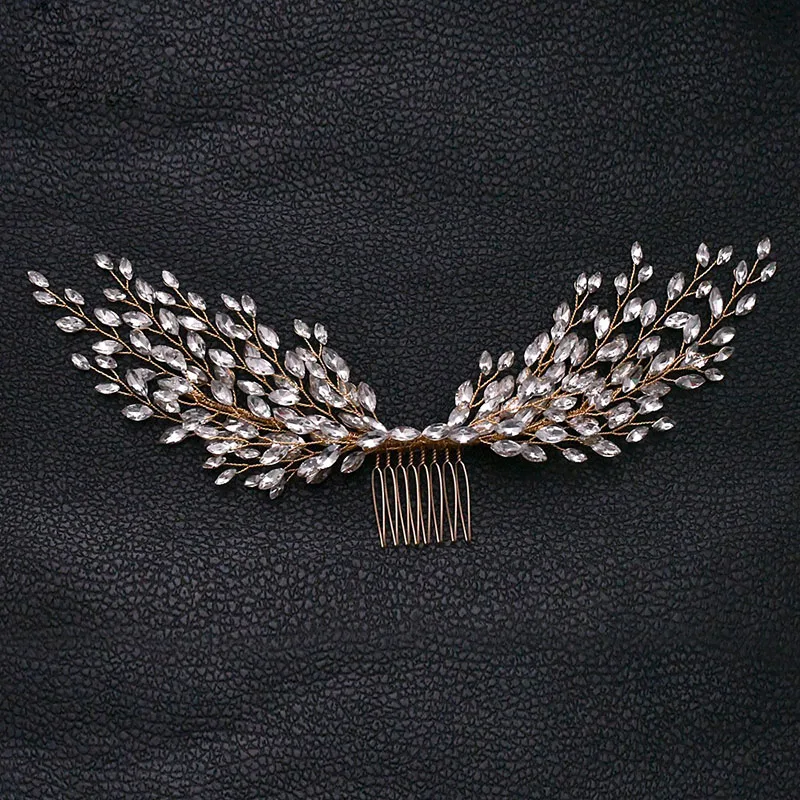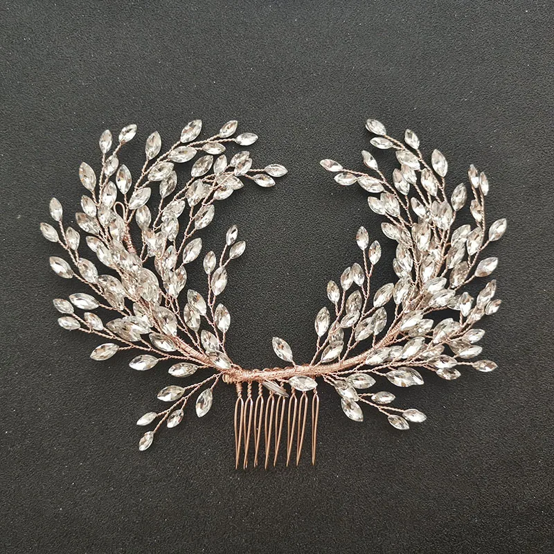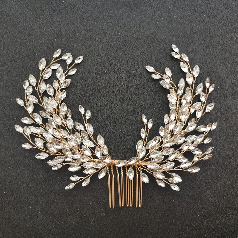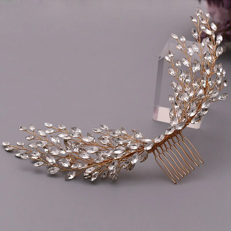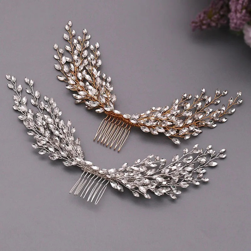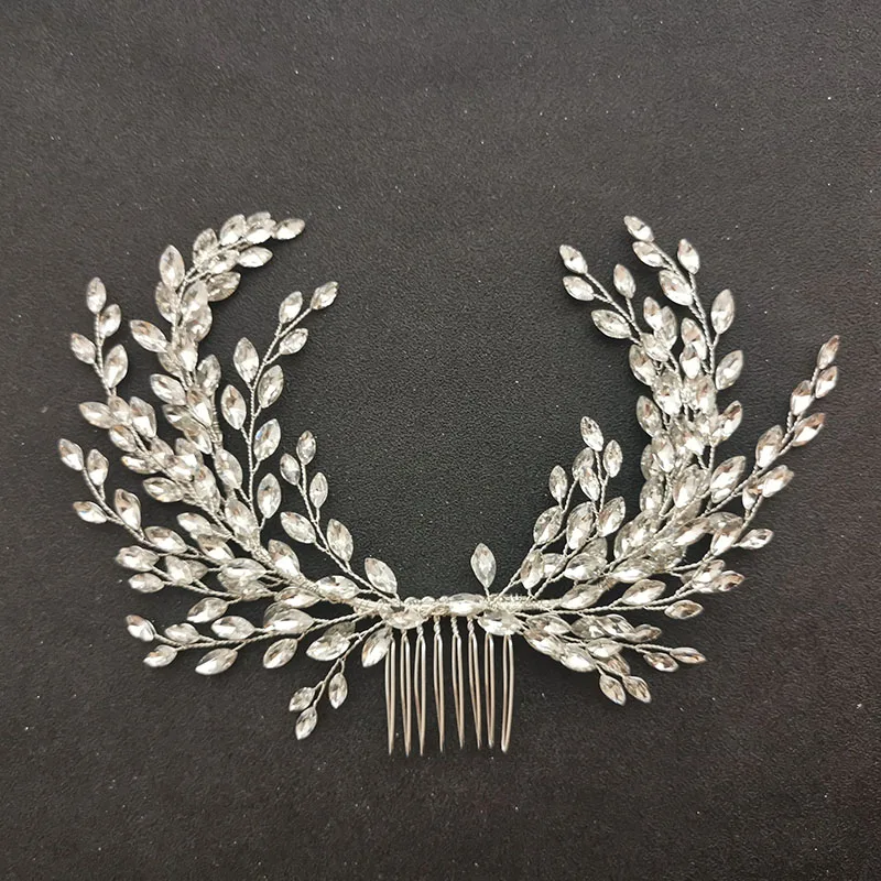 Великолепные Стразы ручной работы с цветком в форме листьев Свадебные украшения гребень для волос свадебные головные уборы аксессуары для волос подружки невесты для женщин Материал: цинковый сплав, кристаллы, носороги Размер: 20 см * 12 см Случаи: свадьба, помолвка, юбилей, вечерние, повседневные