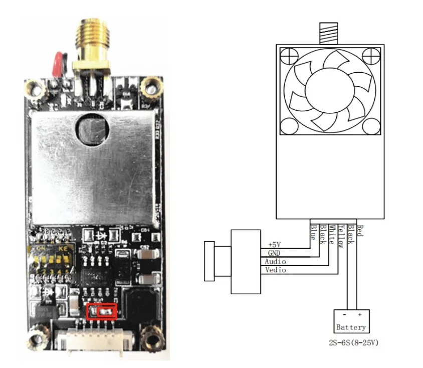 Схема проводки 1: Он подходит для микро-камера с напряжением 3,3-5 В и силе тока меньше, чем 100mA. Если нет условий для проверки того, что камера соответствует вышеуказанному напряжению и условиям тока, этот метод проводки запрещен, в противном случае существует большой риск повреждения передатчика.