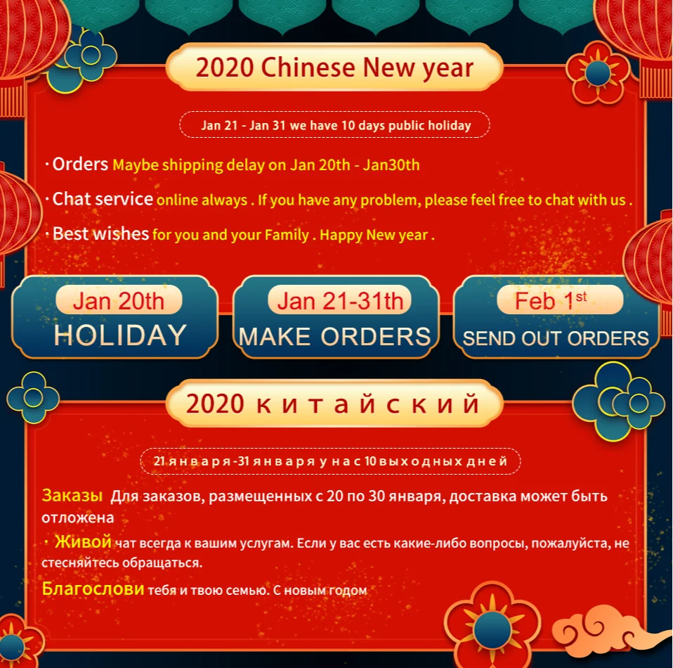 Пожалуйста,Сообщите нам ваш выбор из 9:00. До 18:00 вечера. (GMT + 8) с вечера с полудня по воскресенье.Если у вас есть какие-либо вопросы, пожалуйста, отправьте нам сообщение и дайте нам шанс помочь вам. Если вы не получили наш ответ, пожалуйста, повторите отправку своего сообщения, и мы ответим вам как можно скорее.