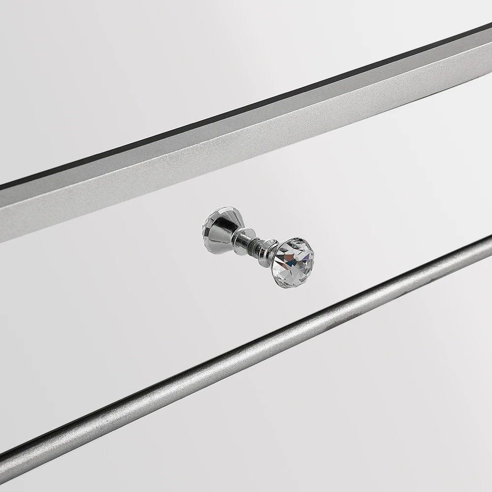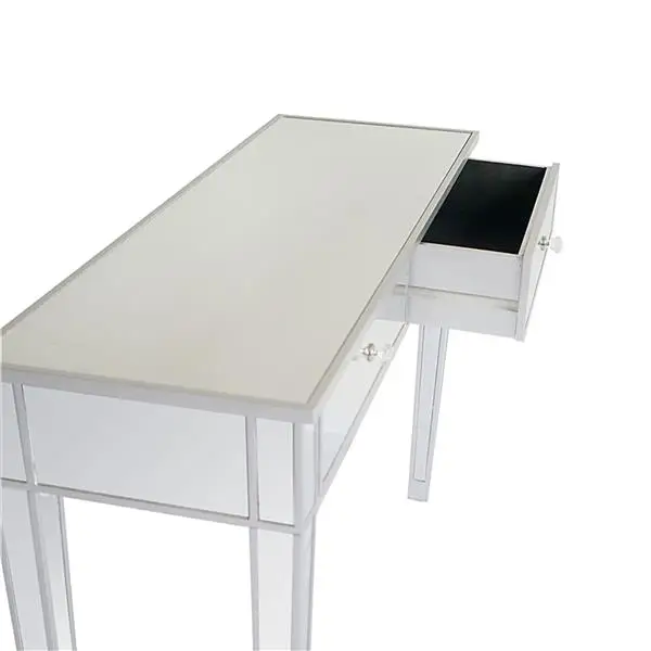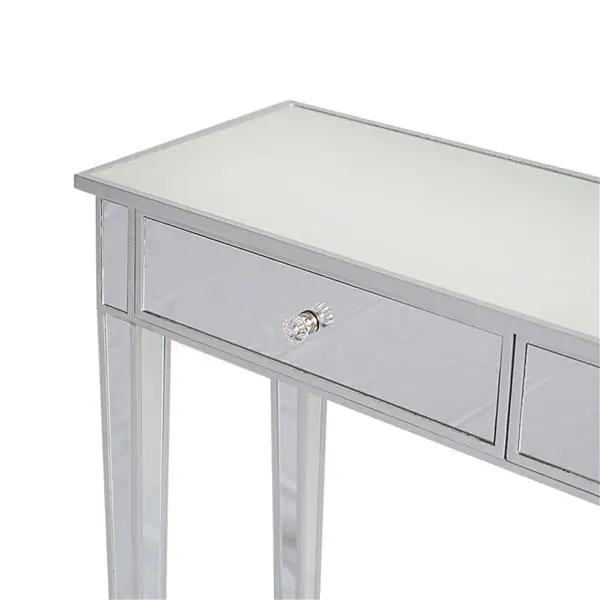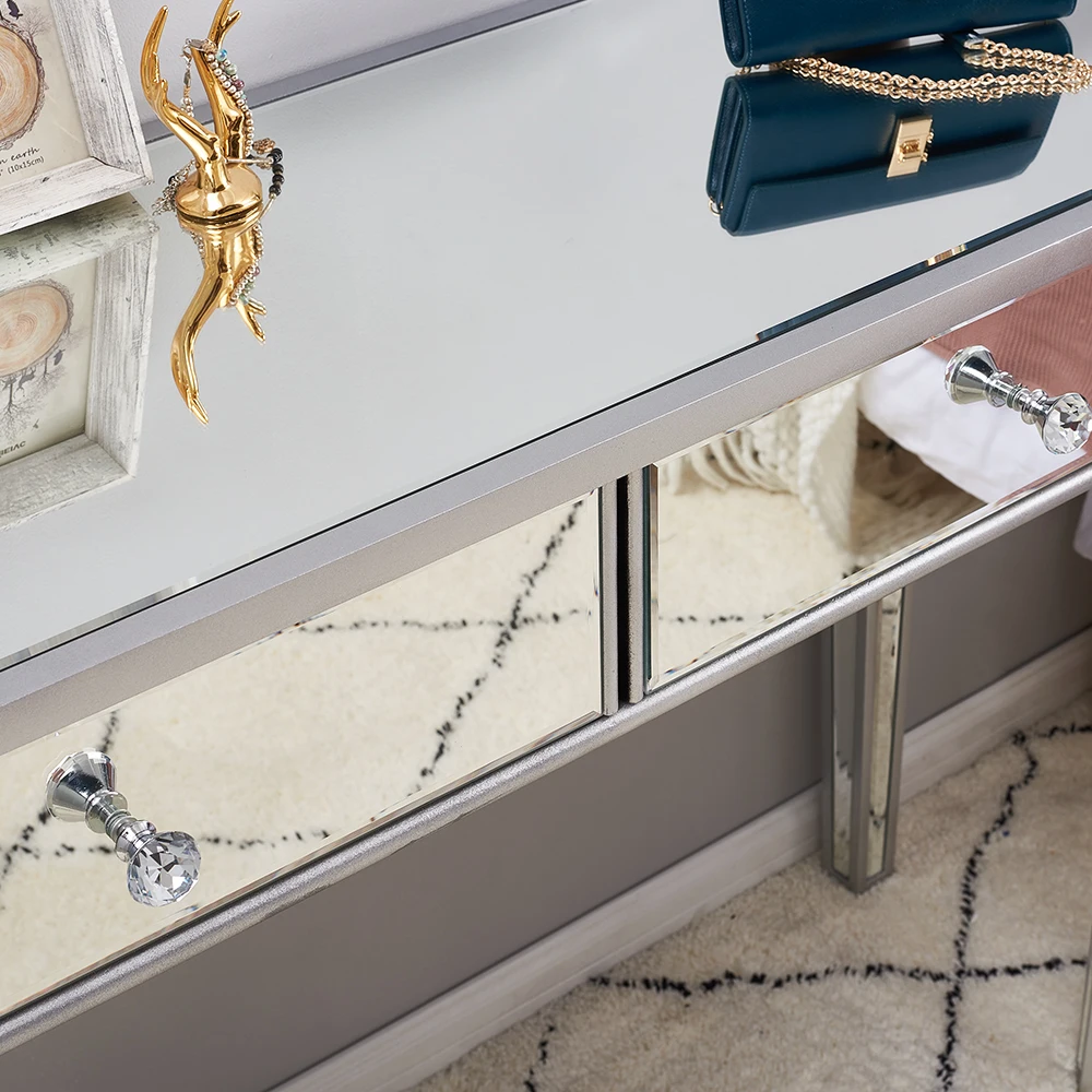Стол имеет два просторных ящика, которые очень легко открываются и закрываются из-за легкого скольжения металлических выдвижных ящиков, это подчеркивает исключительное качество изготовления, которое переходит в создание этой зеркальной мебели. Все ящики имеют ручки с эффектом хрустального стекла, чтобы закончить внешний вид со стилем.