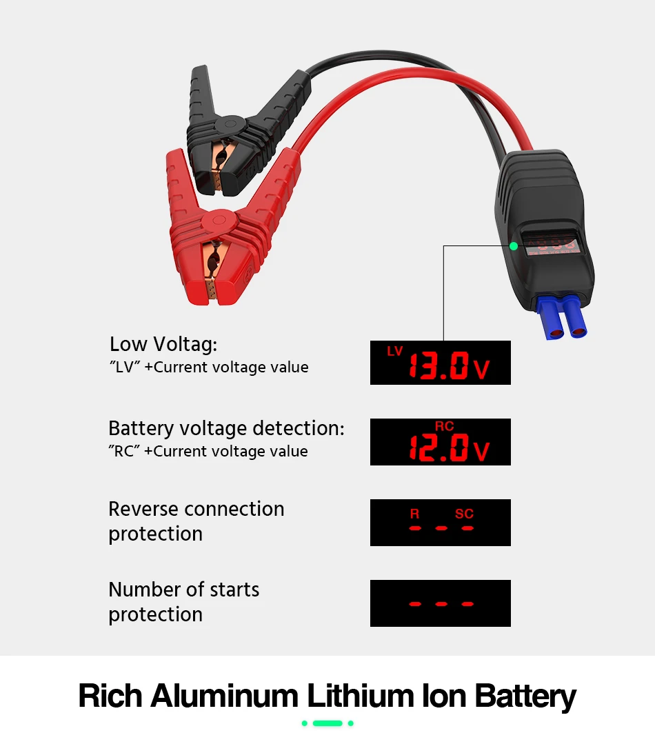 когда загорается красная лампочка и слышен зуммер, зажим подключается к неправильному концу.Соедините зажим, убедитесь, что зеленый свет будет открыт перед переходом на пусковой аккумулятор.