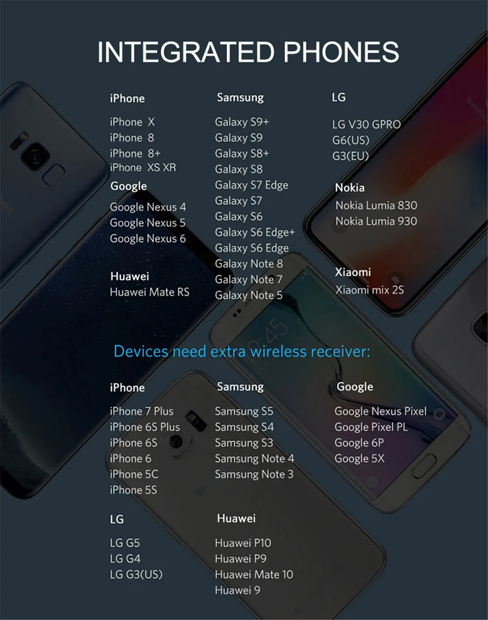 For the phone support QI wireless charging.such as:for iphone 8 8 plus X XS XS MAX for samsung s6 s7 s8 s9 note 7 note 8 note 9 Packaging: 1X Cable 1X Not-slip circle 1X Wireless charger