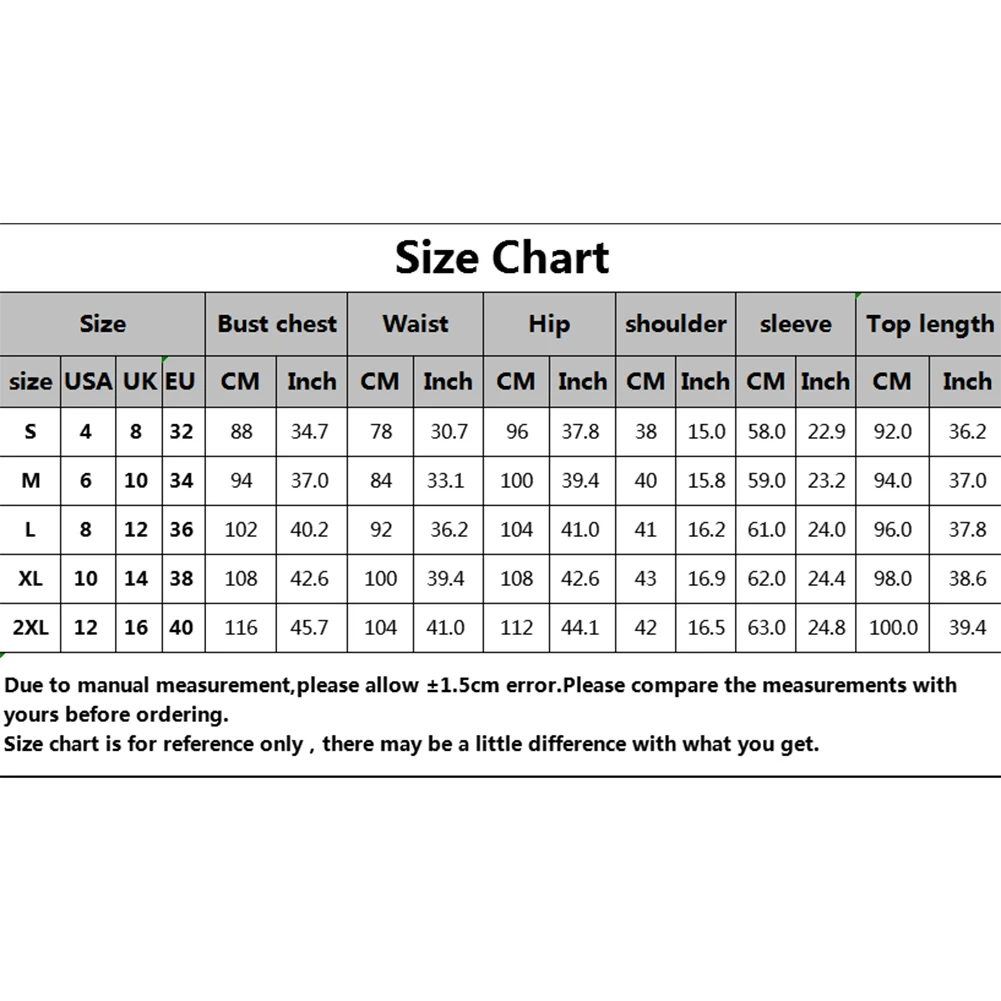 [Наш Размер XL] Обхват груди: 108 см/42,6 дюйма, обхват талии: 100 см/39,4 дюйма, обхват бедер: 108 см/42,6 дюйма, рукав: 62 см/24,4 дюйма, ширина плеч: 42 см/16,5 '', Длина: 98 см/38,6'' (прибл.)