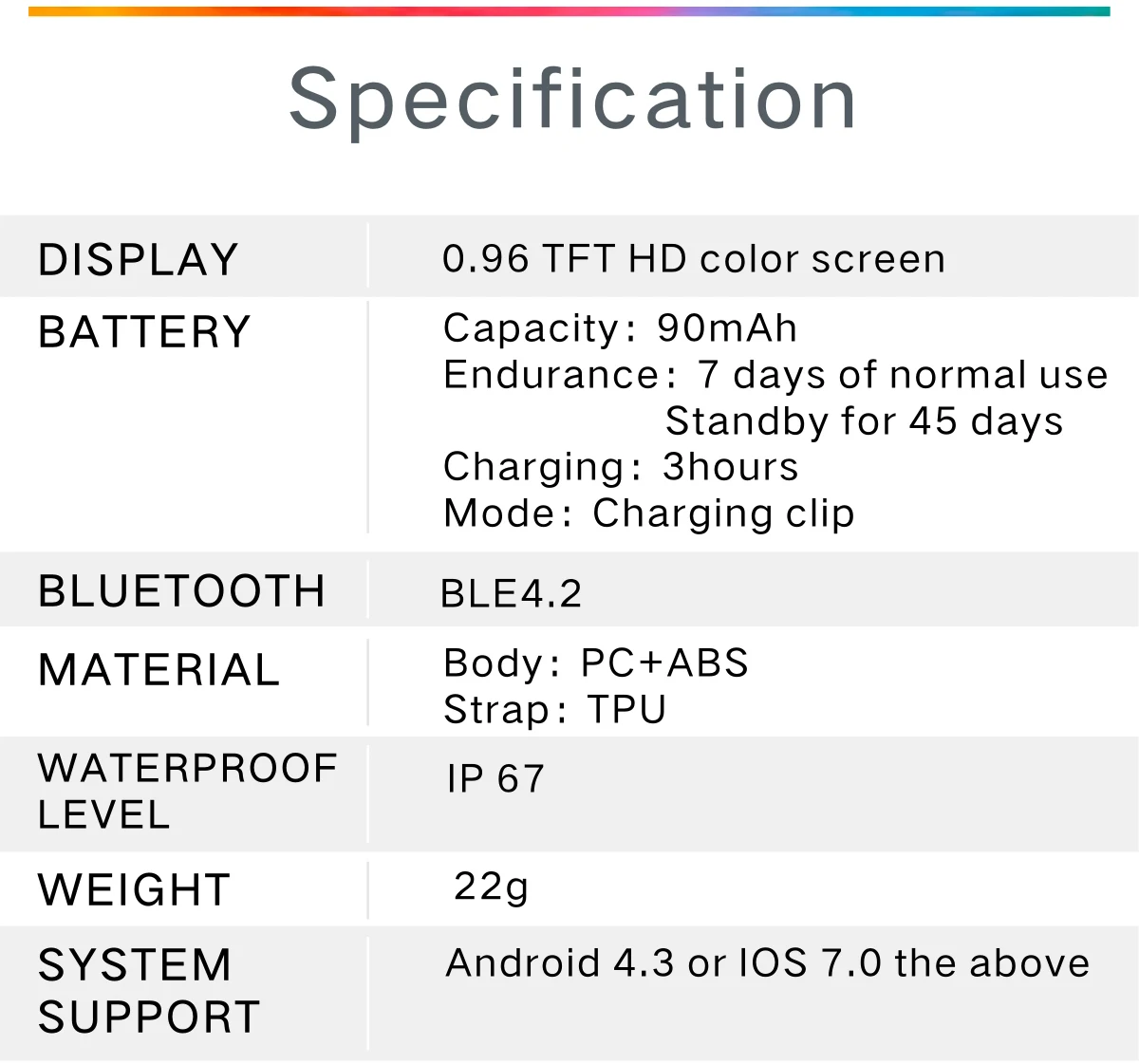 * Аккумулятор: Емкость-90 мА · ч; Выносливость-7 дней нормального использования, режим ожидания-45 дней; Зарядка-3 часа; Режим-зажим для зарядки