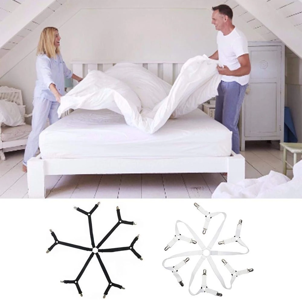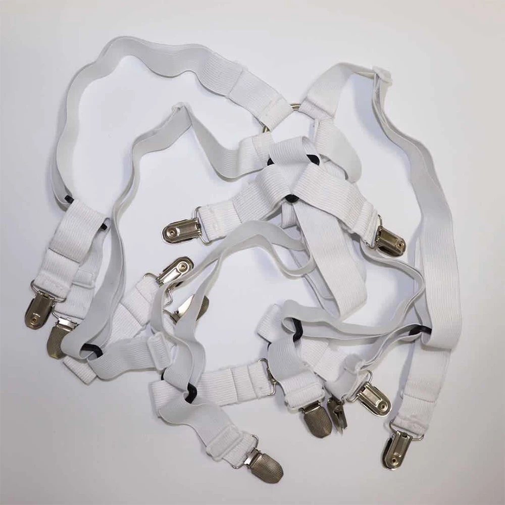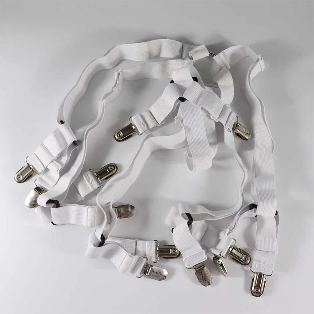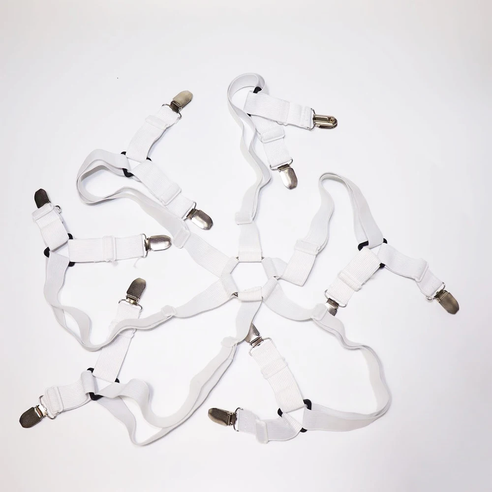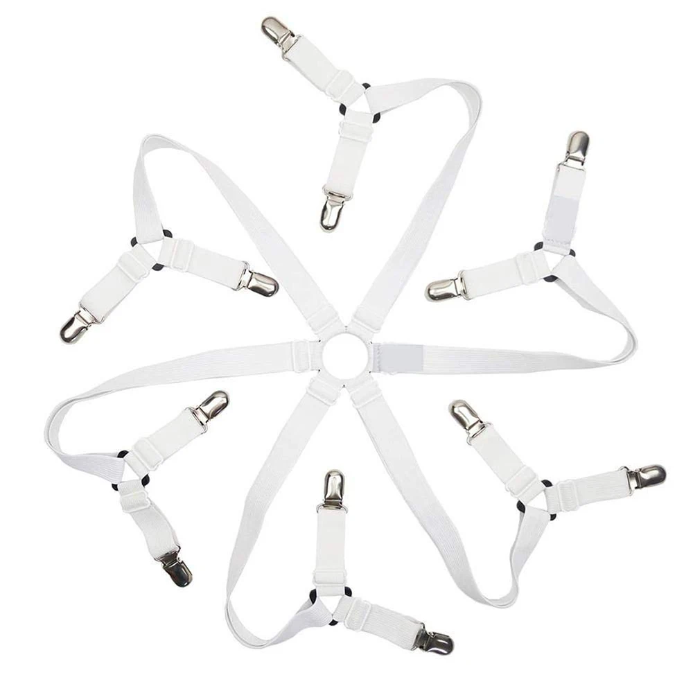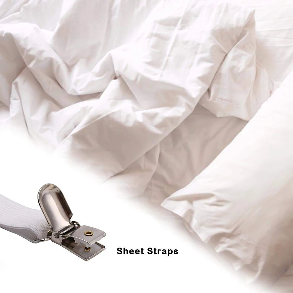 Зажим для простыни изготовлен из прочных хромированных металлических зажимов и сверхмощных широких эластичных Нейлоновых Лент, прочный, экологически чистый и устойчивый к ржавчине.