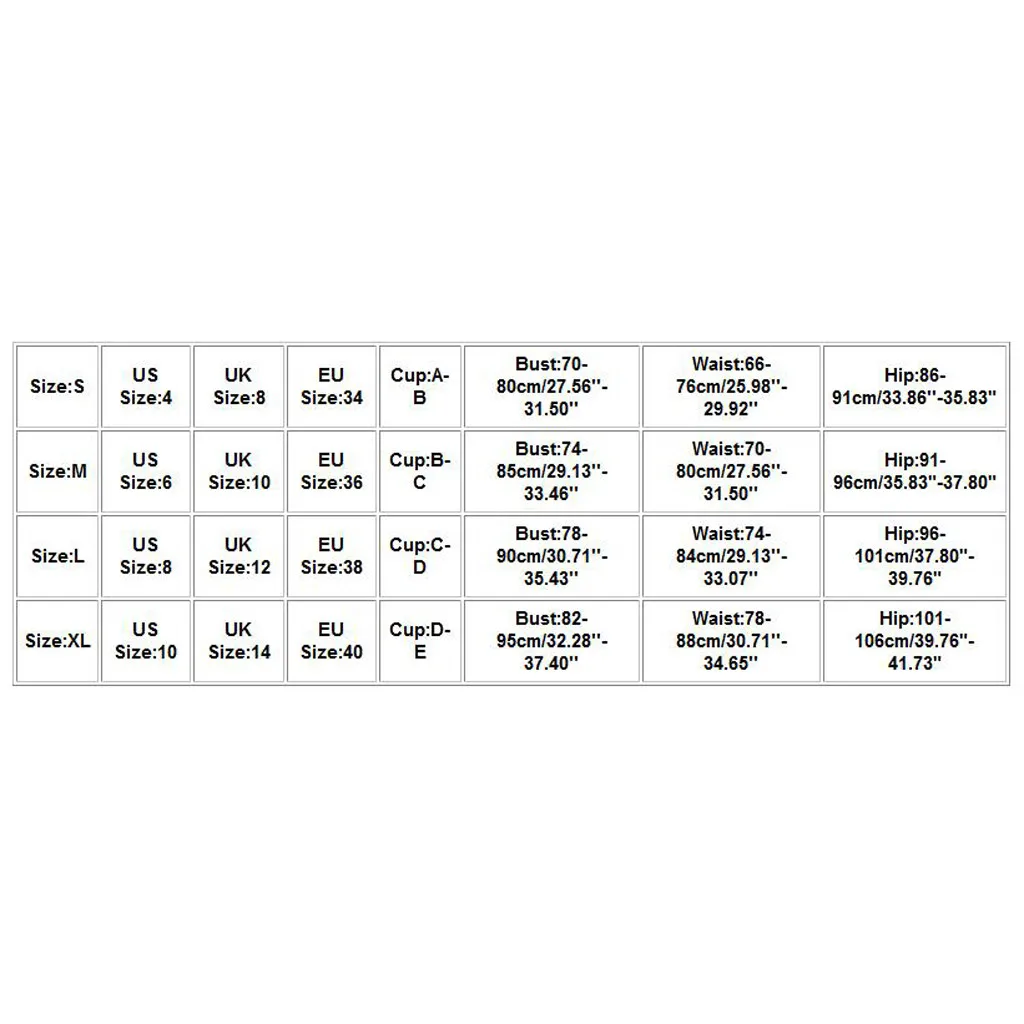 Размер Американский размер Размер Великобритании Европейский размер Чашка Бюст Талия Бедра S 4 8 34 A-B 70-80 см/27,56 ''-31,50'' 66-76 см/25,98 ''-29,92'' 86-91 см/33,86 ''-35,83" М 6 10 36 B-C 74-85 см/29,13 ''-33,46'' 70-80 см/27,56 ''-31,50'' 91-96 см/35,83 "-37,80" L 8 12 38 C-D 78-90 см/30,71 ''-35,43'' 74-84 см/29,13 ''-33,07'' 96-101 см/37,80 "-39,76" XL 10 14 40 D-E 82-95 см/32,28 ''-37,40'' 78-88 см/30,71 ''-34,65'' 101-106 см/39,76 "-41,73"