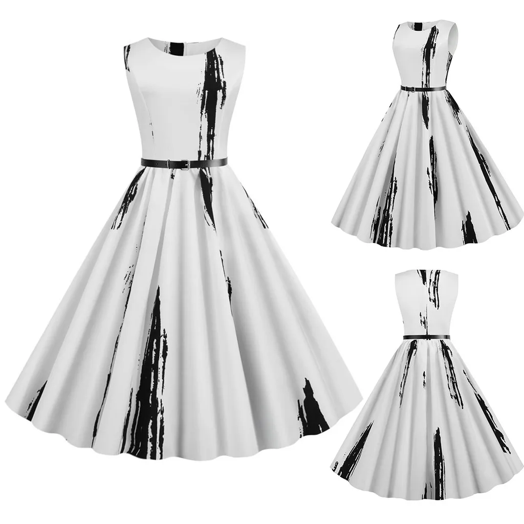 Платье без рукавов с принтом и завышенной талией, а также линии, подчеркивающие достоинства, которые позволят вам чувствовать себя уверенно., привлекательно и эффектно, а-силуэта, с принтом узора.