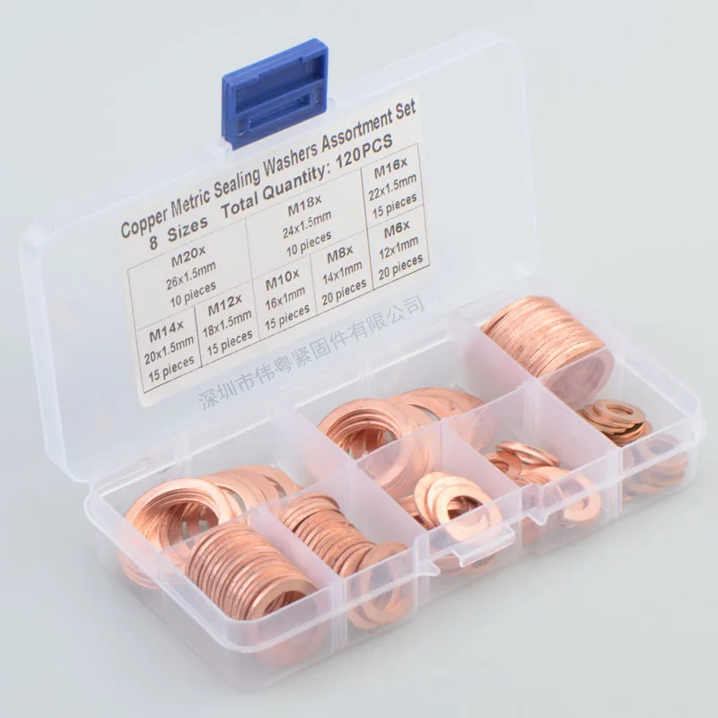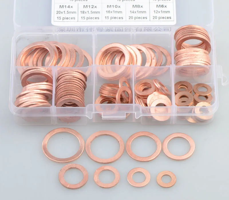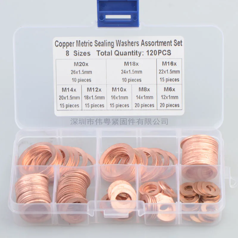盒子尺寸: 13*6,5*2,3 см 120pcs 紫铜油封垫片盒装 密封铜垫片 平垫圈组合套装 产品重: 211,2 г M6 * 12*1 мм (20 шт.) M8 * 14*1 мм (20 шт.) M10 * 16*1 мм-15 шт. M12 * 18*1,5 мм 15 шт. M14 * 20*1,5 мм, 15 шт. M16 * 22*1,5 мм 15 шт. M18 * 24*1,5 мм 10 шт M20 * 26*1,5 мм 10 шт