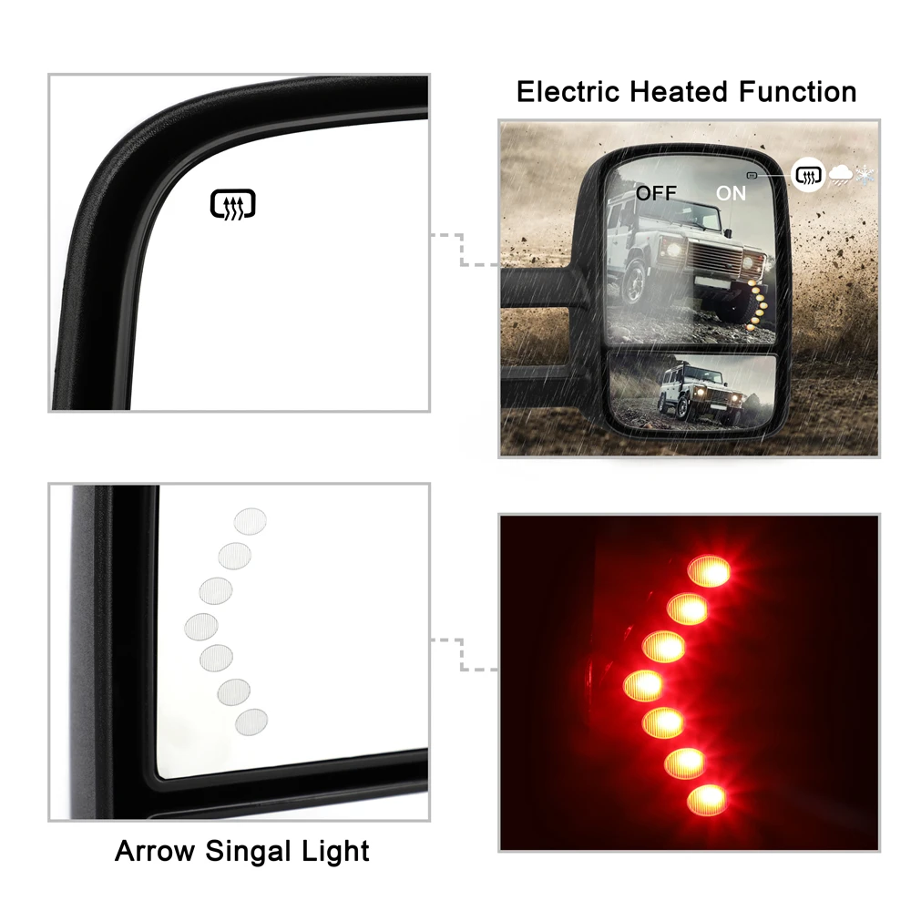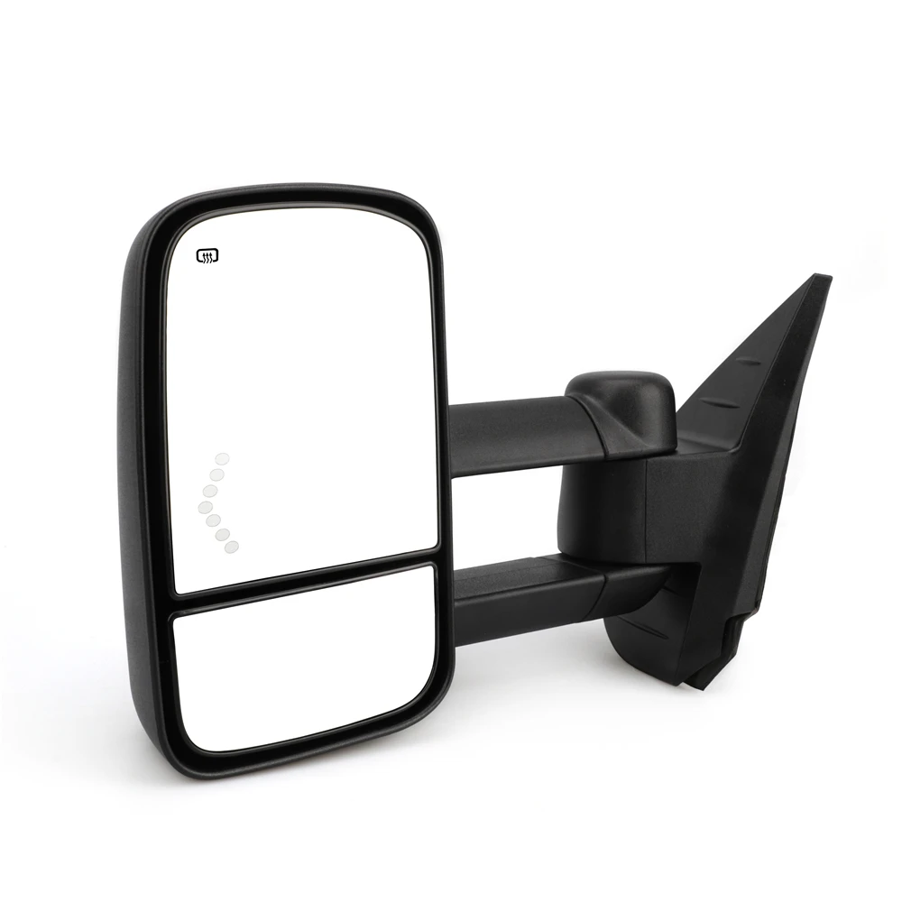 -Для платформы GM GMT900, второго поколения Silverado sierra -Продается как пара, включая LH (сторона водителя) и RH (пассажирская сторона) -Питание, только плоское зеркало -Ручная телескопическая/Складная, Двойные руки -Длина зеркала составляет примерно от 18,5 "21" -Размер зеркала 12 "× 8", включает плоское зеркало и выпуклое зеркало -С подогревом мощность размораживания -Светодиодный индикатор поворота на стекле, светодиодный фонарь со стрелкой -Алюминиевая основа, Черный ABS Пластиковый Чехол -Гарантия 12 месяцев