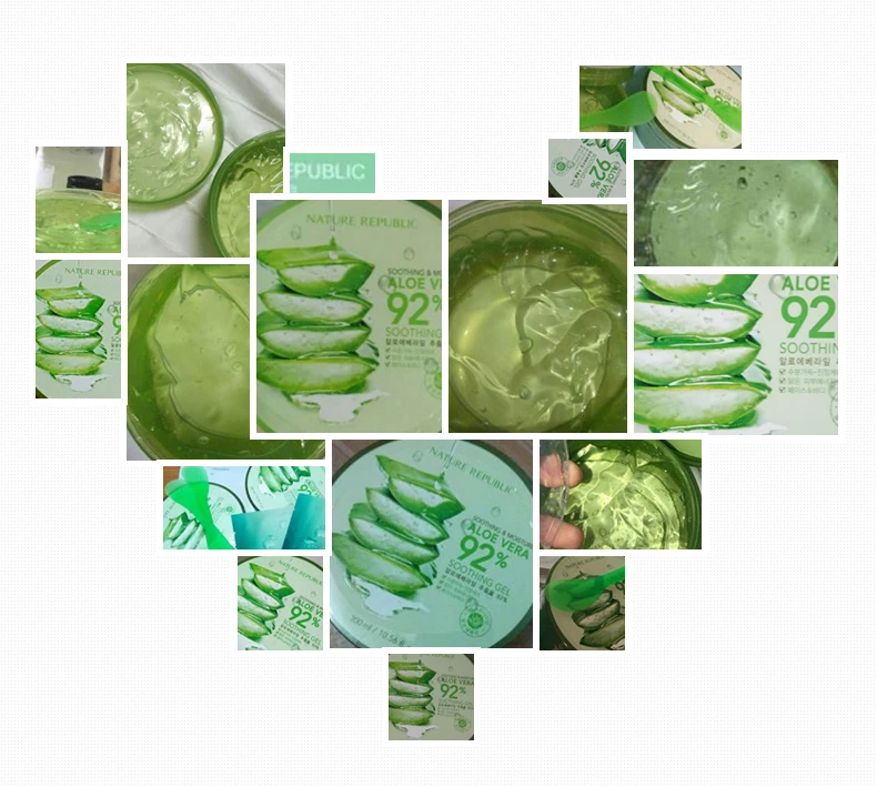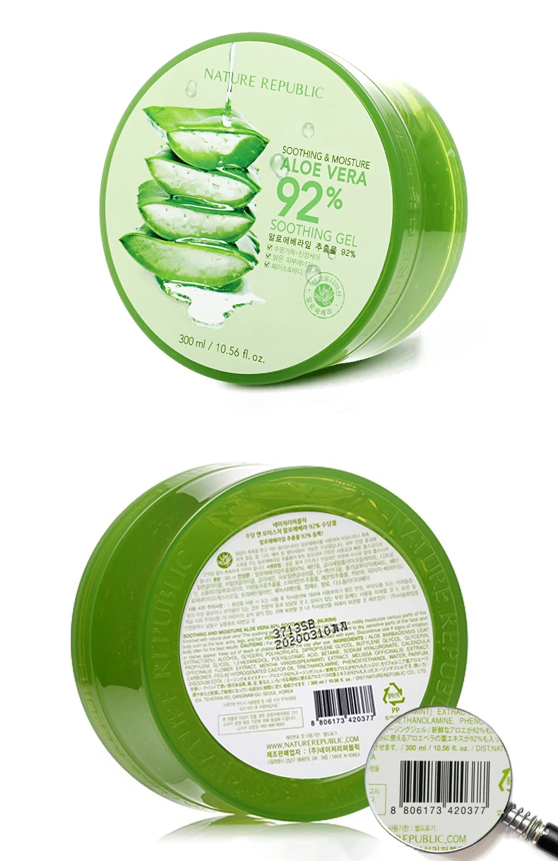 1. Этот гель с алоэ вера, изготовленный из 92% алоэ вера, первичная жидкость от Chejudo, Южная Корея, эффективно снимает усталость, зуд и другие дискомфорта после солнечных ожогов. 2. Этот гель с алоэ вера эффективно облегчает все виды кожи, такие как сухость, жирность и ломкость, вызванные солнцем, климатом и укусами комаров. 3. Этот гель с алоэ вера содержит экстракт алоэ вера и брадикиназа, которые помогают предотвратить акне и уменьшить усталость и воспаление, вызывающие акне. 4. Нежирный гель алоэ вера легко впитается в кожу, эффективно успокаивает и увлажняет. 5. Его также можно использовать в качестве маски, лосьона для тела и крема для ухода за волосами в различных целях. 6. Срок годности: 3 года 7. Подходит для: всех сезонов и всех видов кожи 8. Без алкоголя 9. Сделано в Корейском стиле Посылка включает в себя: 1*300 мл гель алоэ вера