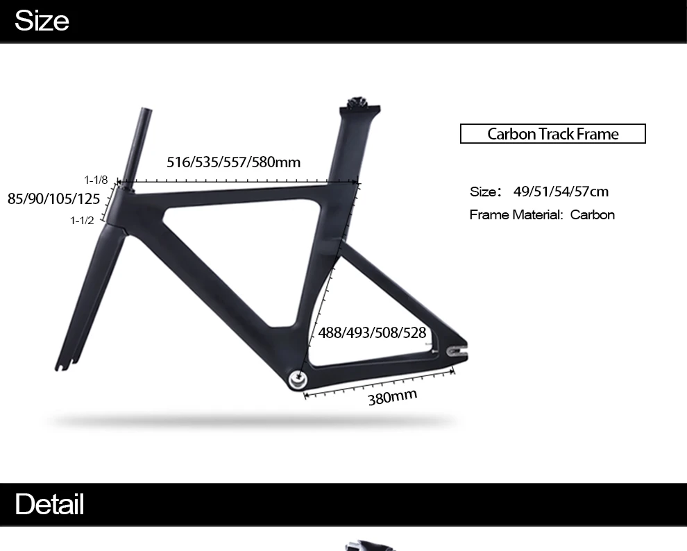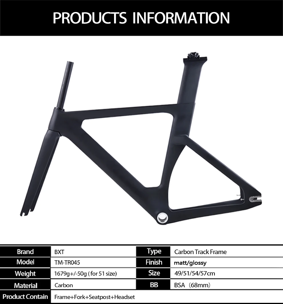 T800 углерода трековая рама Комплект рамы: рама + вилка + гарнитура + подседельная стойка Материал: углеродное волокно Toray T800 UD Вес: 1679 +-50 (размер 51 см) Подходящий Нижний Кронштейн: BSA Отделка: матовая/глянцевая Материал: углеродистая Доступные размеры: 49/51/54/57 см