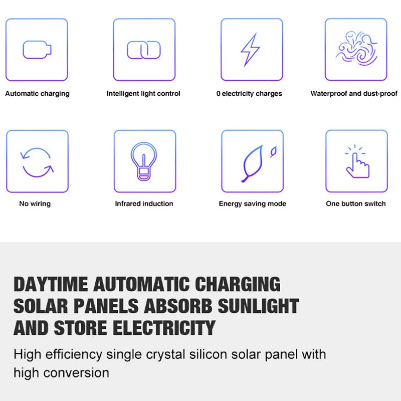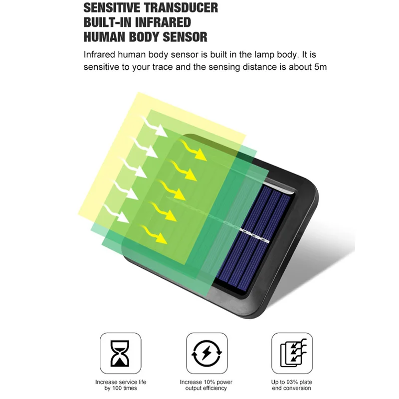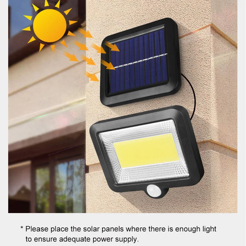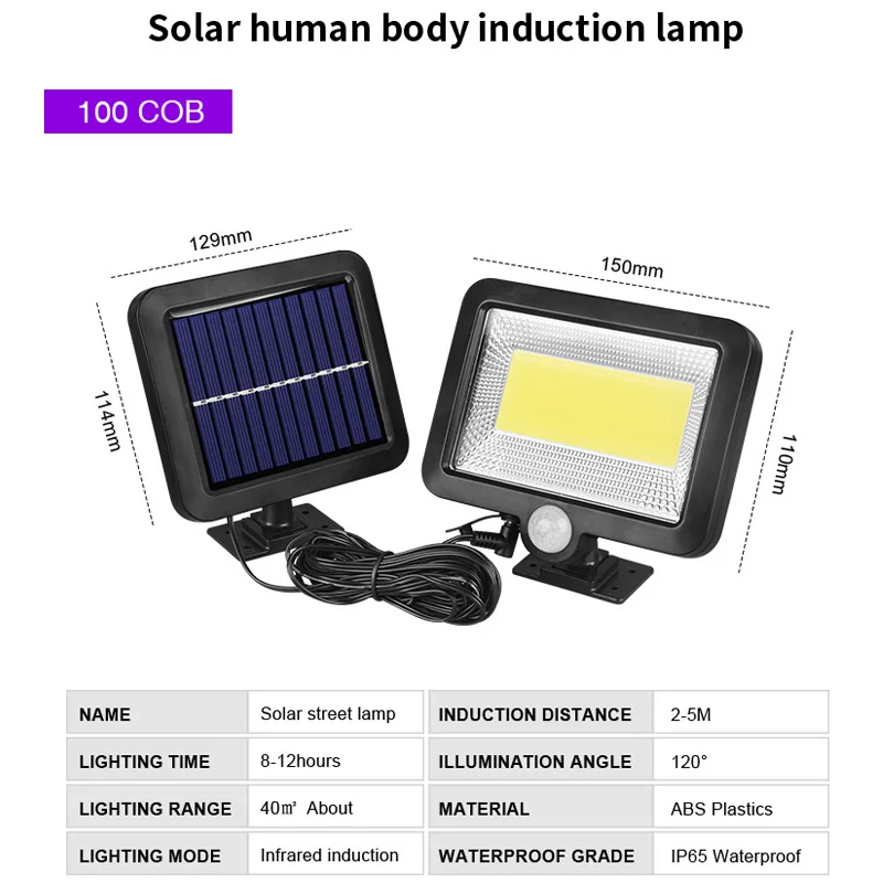 Легко установить, просто прикрутите изделие на стене.На солнечной энергии, уличная лампа с солнечной батареей, используя энергию солнца для вашего ночного освещения.Включить светильник выключателя в течение дня не включено, только в ночное время Включите переключатель, когда датчик обнаруживает, что тело человека может получить светильник высокой яркости.IP65 водонепроницаемая, термостойкая Солнечная лампа, подходит для большинства типов погоды.Солнечные наружные фонари освещают Ваш сад, двор, проходы, крыльцо, двор или подъездную дорожку и т. д.Продукт оснащен 5 метровой солнечной панелью, COB 48/56/100/120 лампой, сильной яркостью, водонепроницаемостью на открытом воздухе.