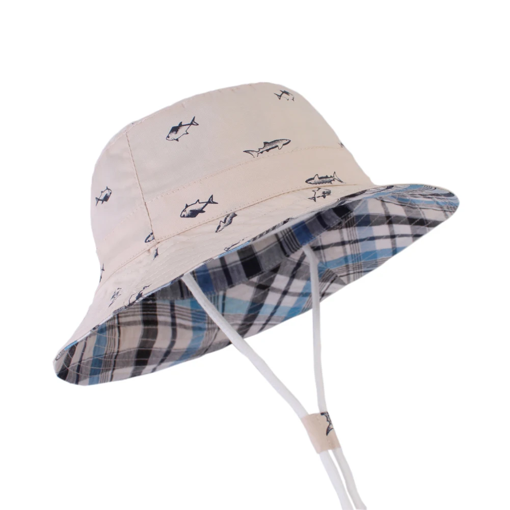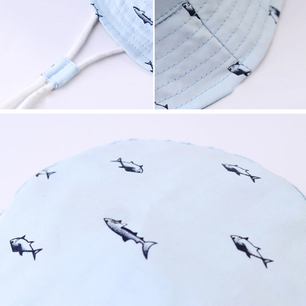 Детская летняя Солнцезащитная шляпа с принтом рыбы из мультфильма, УФ-защита, Панама с ремнем для подбородка