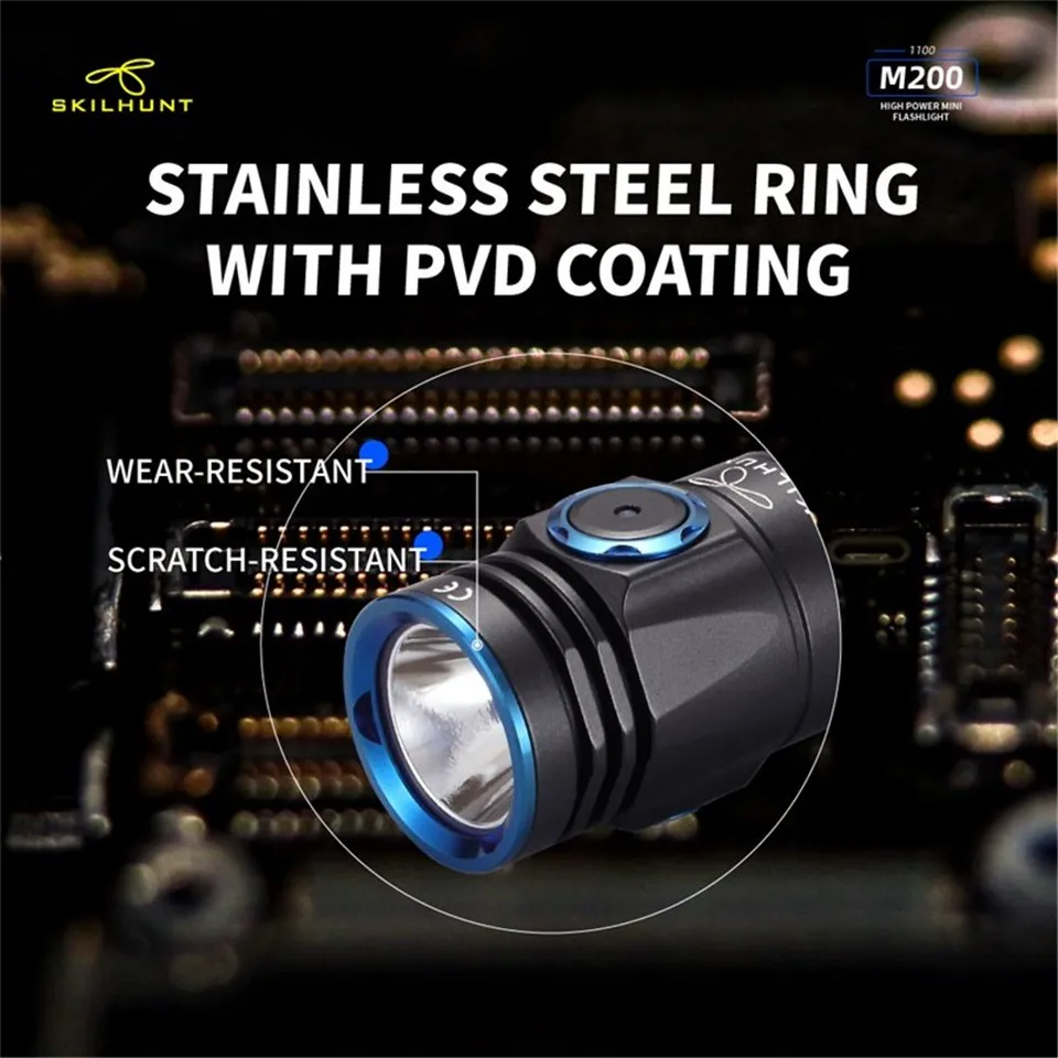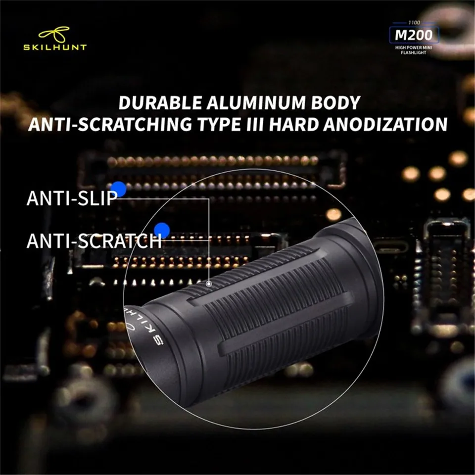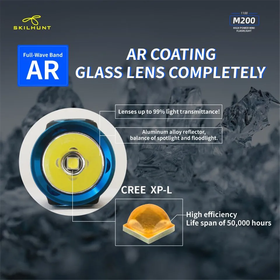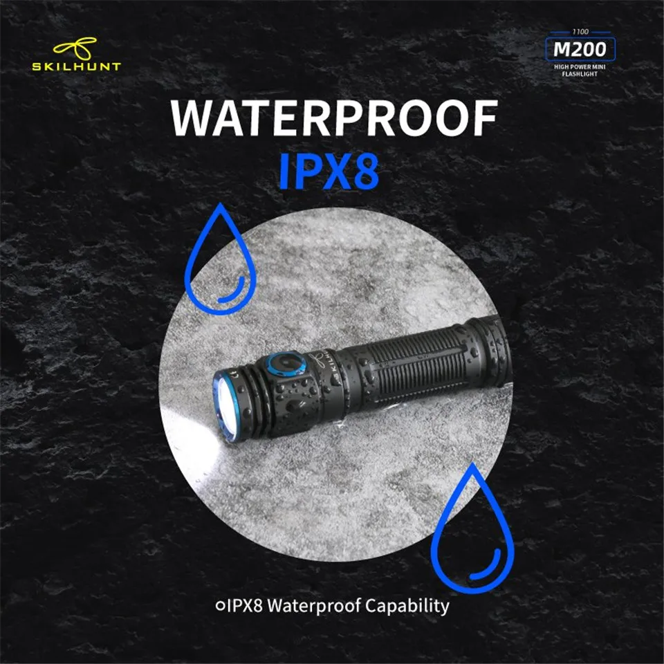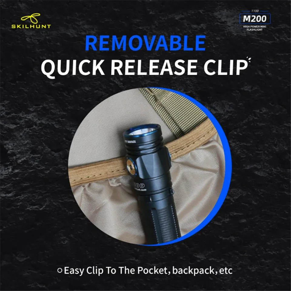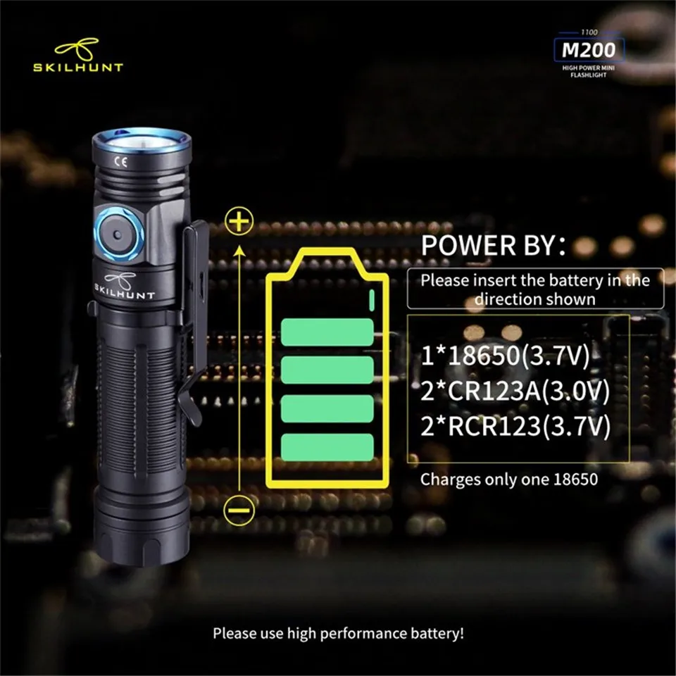 M200 Новый светодиодный фонарик Светодиодный: CREE XP-L Максимальная мощность: ANSI 1100 лм Максимальное время работы: несколько месяцев Максимальное расстояние луча: 161 м/171 м Максимальная Пиковая интенсивность луча: 6500 cd / 7300 cd Водонепроницаемый: IPX-8 Ударопрочность: 1 метр Аккумулятор: 1 × 18650, Номинальный диапазон: 2,7 V ~ 8,4 V Размер: Длина 104,5 мм/4,11 дюйма Диаметр головки 23,5 мм/0,93 дюймов Диаметр корпуса 22,0 мм/0,86 дюйма Вес: 44 г/1,55 унций (без аккумулятора) Аксессуары: руководство пользователя, запасное уплотнительное кольцо, ремешок, зажим, Магнитный зарядный кабель.