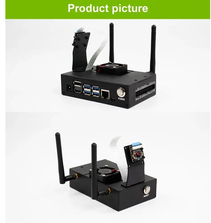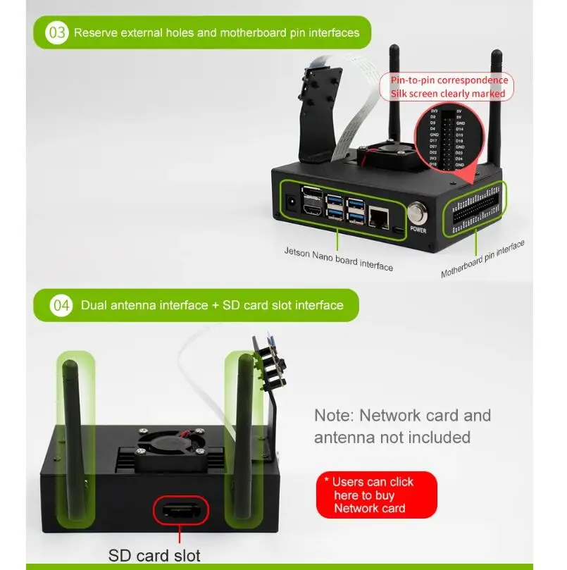 В целом используется черный металлический материал, прочный, пыленепроницаемый и красивый. Лицевая сторона чехол обладают DC источника питания, 2 дисплей интерфейсов, 4 USB интерфейсами, сетевой кабель и включите питание для пуговиц; Левая сторона оснащена кнопку reset (Перезагрузка) установочное отверстие; правая сторона открывается с отверстием для интерфейса GPIO, одно-в-одном соответствует Jetson Nano pins и четкой маркировке Шелкового экрана.