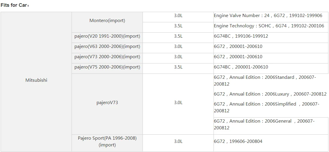 MITSUBISHI Pajero / Shogun II (V20) (177 - 208 PS, 06,1994-10,1999) Pajero / Shogun II Canvas Top (V20) (181 PS, 06,1994-04,2000) pajero/Shogun III внедорожник конвертируемый (V6_W, V7_W) (170 PS, 10,2001-12,2006) Pajero / Shogun Sport I Off-Road (K70, K90) (167 - 177 PS, 09,1996- ... ) Pajero / Shogun Sport I Van (K90) (170 PS, 12,1999-01,2008)