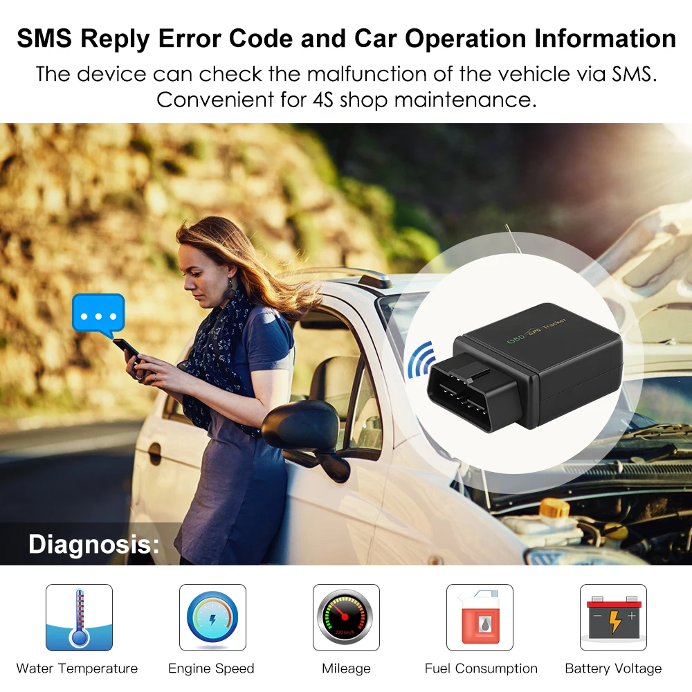Устройство может проверить неисправность транспортного средства через SMS. Удобно для 4S обслуживания магазина. Диагностика: температура воды, скорость двигателя, пробег, расход топлива, напряжение батареи