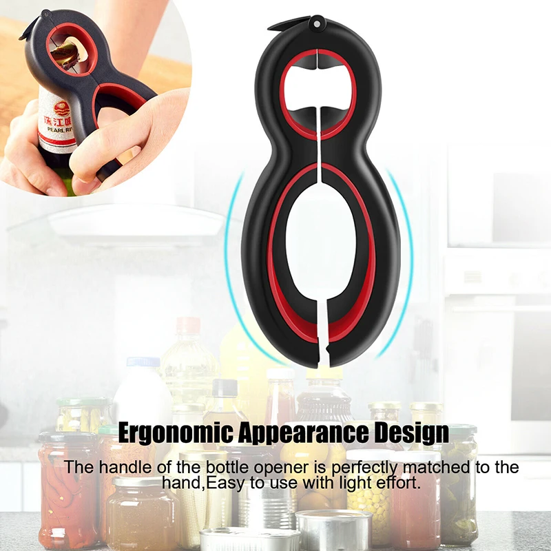 Этот многофункциональный открывалка 6 в 1 с широким углом Подходит для открытия пива, вина, банки и других колпачков для бутылок, банок и т. д. Абсолютно хороший помощник кухонной посуды, который может открыть колпачки, не повреждая руки или используя слишком много силы.