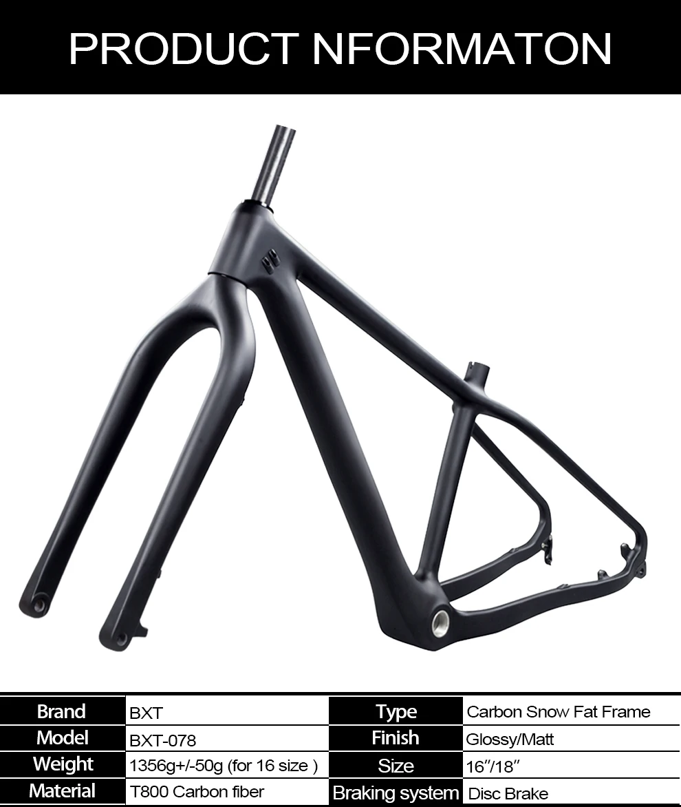 Тип: снежная оправа Отделка: глянцевая/матовая Тормозная система: дисковый тормоз Вес: 1356 г +/-50 г (для 16 размеров) Материал: углеродное волокно T800 Размер рамки: 26er * 16/18 дюймов Вилки подходящие колеса: 26erx4.8/5.0 шины Подходящие колеса оправы: шины 26erx4.8 Подседельный штырь: 31,6 мм Зажим: 37 мм Нижний Кронштейн: BSA 100 мм Гарнитура: 1-1/8-1-1/2 коническая Дисковый тормоз вилки: 160 мм Дисковый тормоз рамы: 160 мм Расстояние между крючками сзади: 190x9 мм Расстояние между осями сзади: 197x12 мм