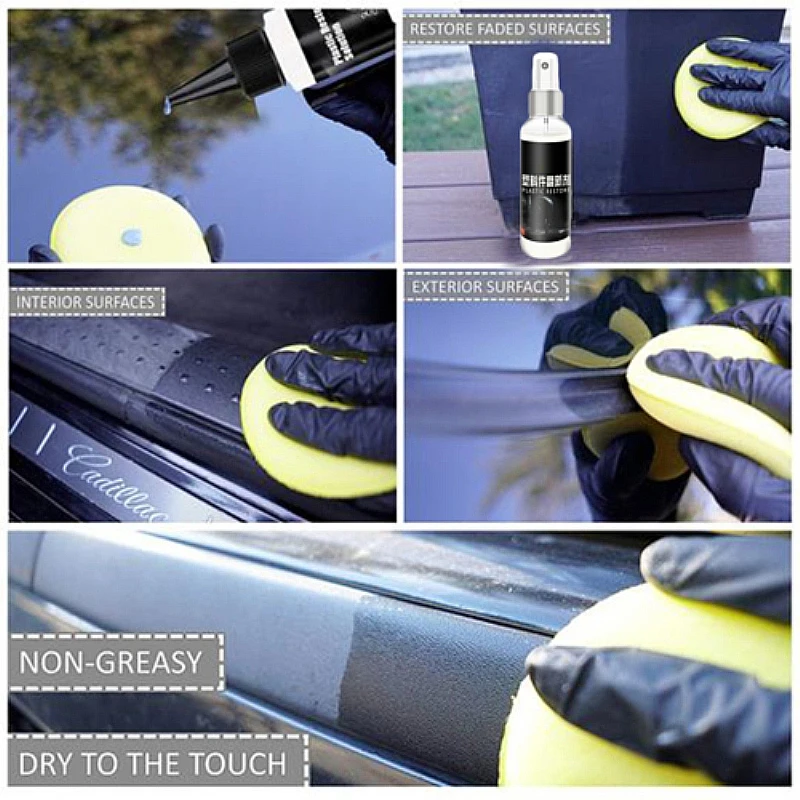 Пластиковое решение для восстановления прост в использовании. Просто протрите его губкой на желаемой области, пока не достигнете желаемого черного цвета поверхности вашего автомобиля.