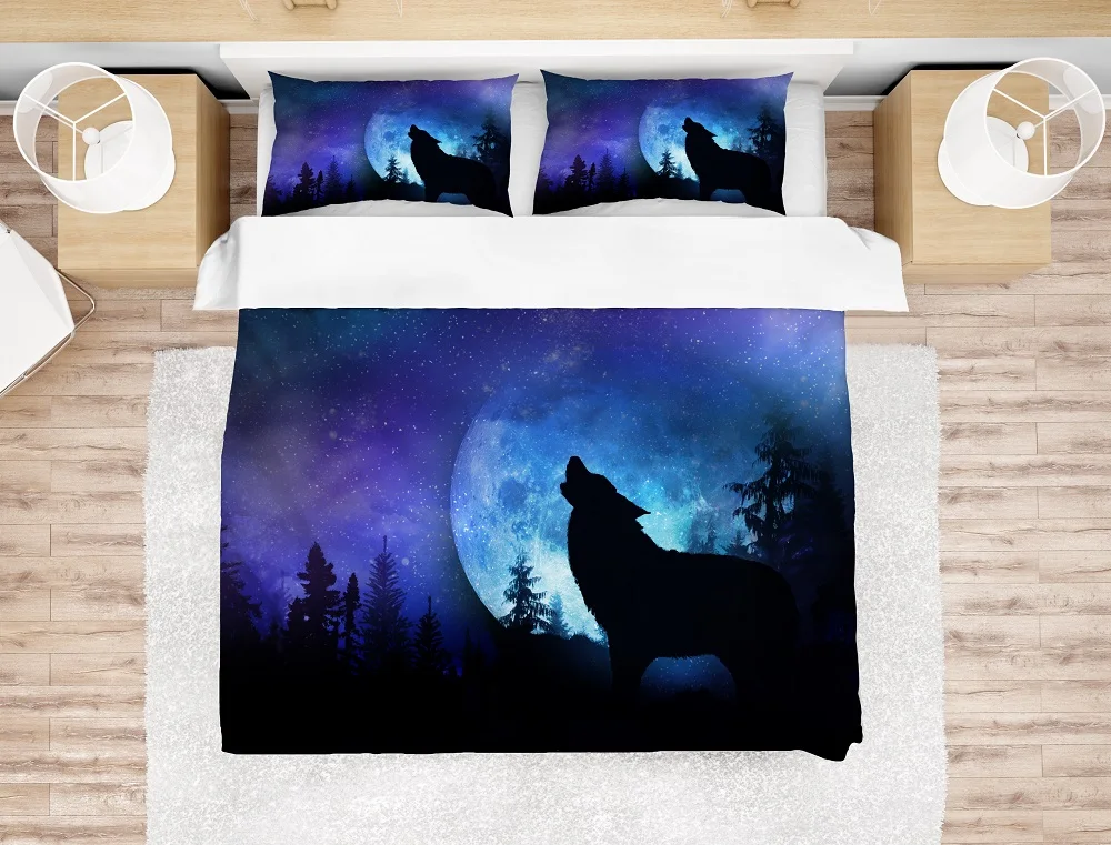 Комплекты постельного белья с изображением волка, Луны и галактики, звезд, пододеяльник, набор, с принтом леса, зимний домашний покрывало для девочек, Твин, полный, королева, король