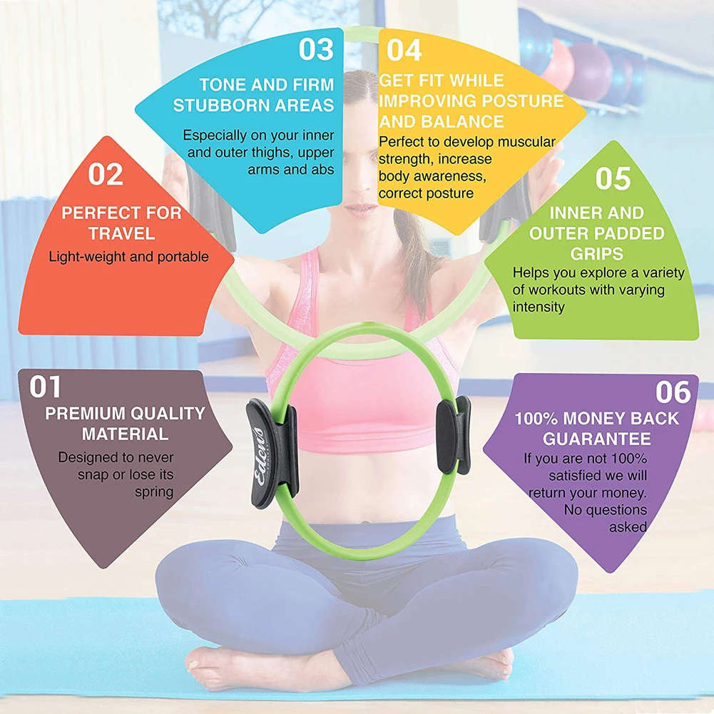 Пункт конкретные: Диаметр: 38 см/14,97 дюйма. Цвет: синий/фиолетовый/серый/зеленый/розовый красный Подходят и крепкие: Пилатес улучшает тонус мышц и фитнес, когда вы регулярно тренируетесь. Светильник вес, портативный: идеально подходит для путешествий, светильник вес (кольцо (Метал отсутствует), лежит на плоской подошве и добавляет очень маленький объем. Идеальная осанка: Идеально подходит для тех, кто хочет развить мышечную силу, повысить самочувствие, улучшить выносливость и правильную осанку. Описание продукта: Повышает мобильность, гибкость и выносливость. Улучшает общий фитнес для спорта и повседневной жизни. Развивает мышцы брюшной полости и силу спины. Кольца обычно используются для пилатеса, чтобы добавить интенсивность к упражнениям на полу. Сопротивление кольца ускоряет тонизирование путем наведения конкретных мышц. Особенно полезно в проблемных областях, таких как внутренние и внешние бедра, верхние руки, грудь и даже тазовые мышцы. Кольцо диаметром 14 дюймов обеспечивает сопротивление при выполнении разнообразных упражнений, которые работают как в верхней, так и в нижней части тела. Посылка включает в себя: 1 x кольцо для пилатеса для фитнеса