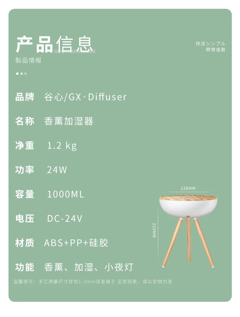 1. Вес нетто: 1,2 кг 2. Мощность: 24 Вт 3. Материал: АБС + ПП + силикон 4. Функция: ароматерапия, увлажнение, ночник напоминание: это нормально, если размер ручного измерения имеет погрешность 1-3 мм, пожалуйста, обратитесь к фактическому продукту