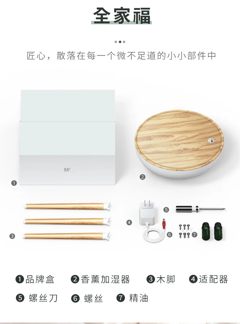 1. Фирменная коробка 2. Увлажнитель для ароматерапии 3. Деревянные ножки 4. Адаптер 5. Отвертка 6. Винты 7. Эфирное масло