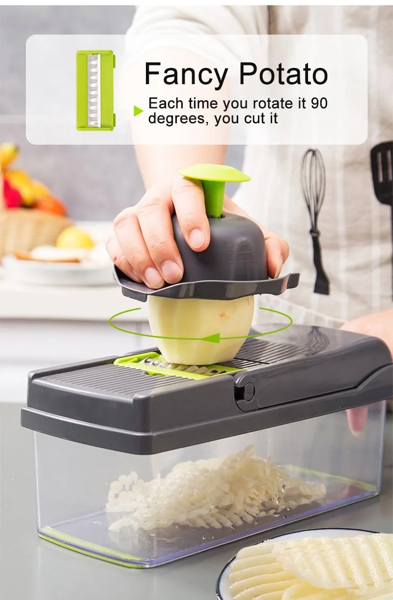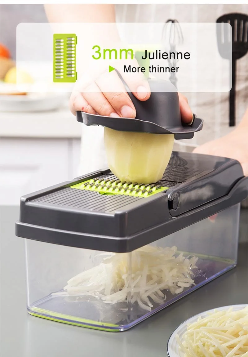 Кухонный помощник:Этот ручной слайсер изготовлен из пищевой нержавеющей стали и АБС-пластика без BPA. Он предлагает все функциональные возможности нескольких приборов со сменными нержавеющими лезвиями. Эти лезвия можно разрезать через все виды овощей, терка сыра, нарезка картофеля и резки фруктов, даже можно создать пастообразные овощи или пюре.