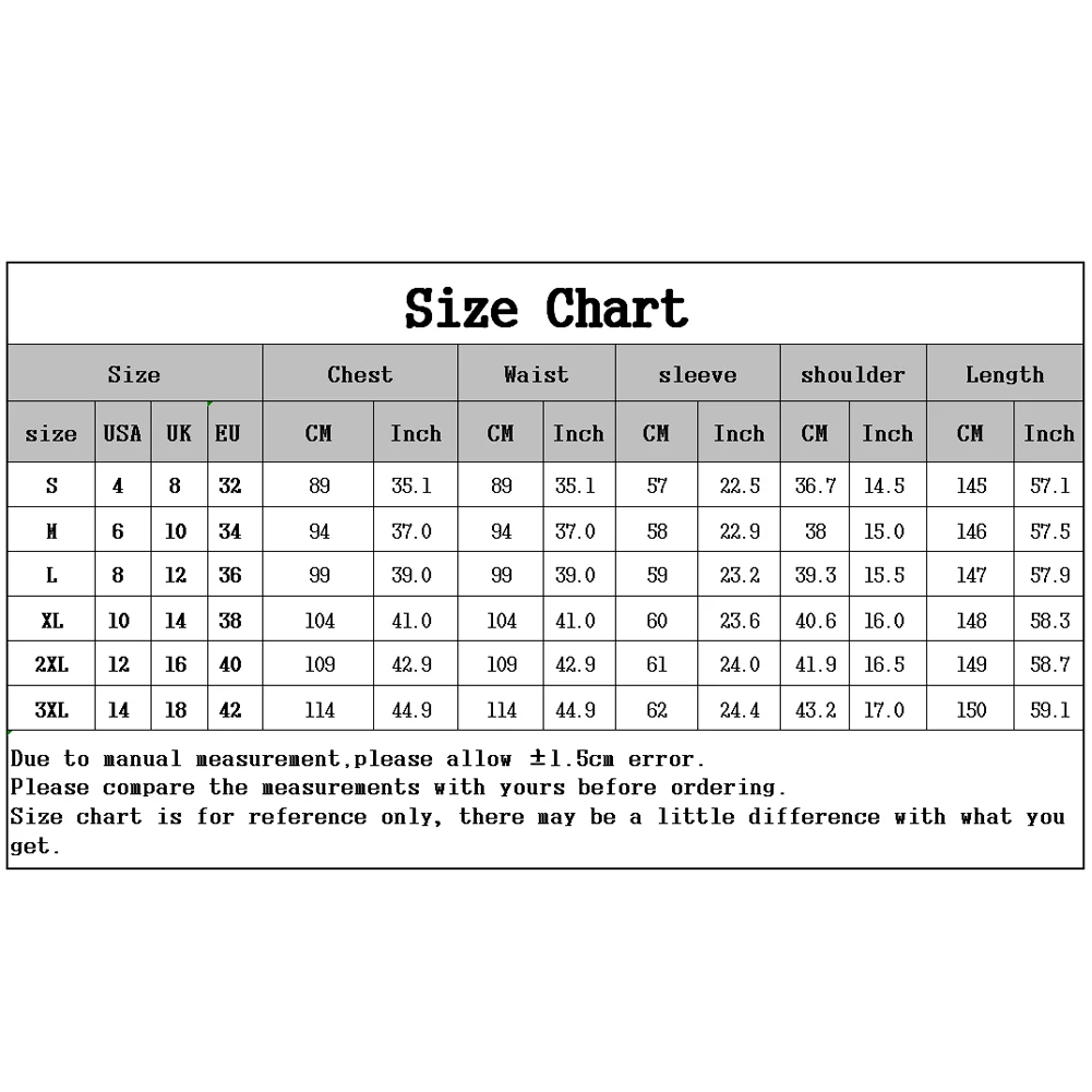 [Наш Размер 3XL] Обхват груди: 114 см/44,9 дюйма, обхват талии: 114 см/44,9 дюйма, длина: 150 см/59,1 дюйма, длина рукава: 62 см/24,4 дюйма, ширина плеч: 43,2 см/17,0 "(прибл.)