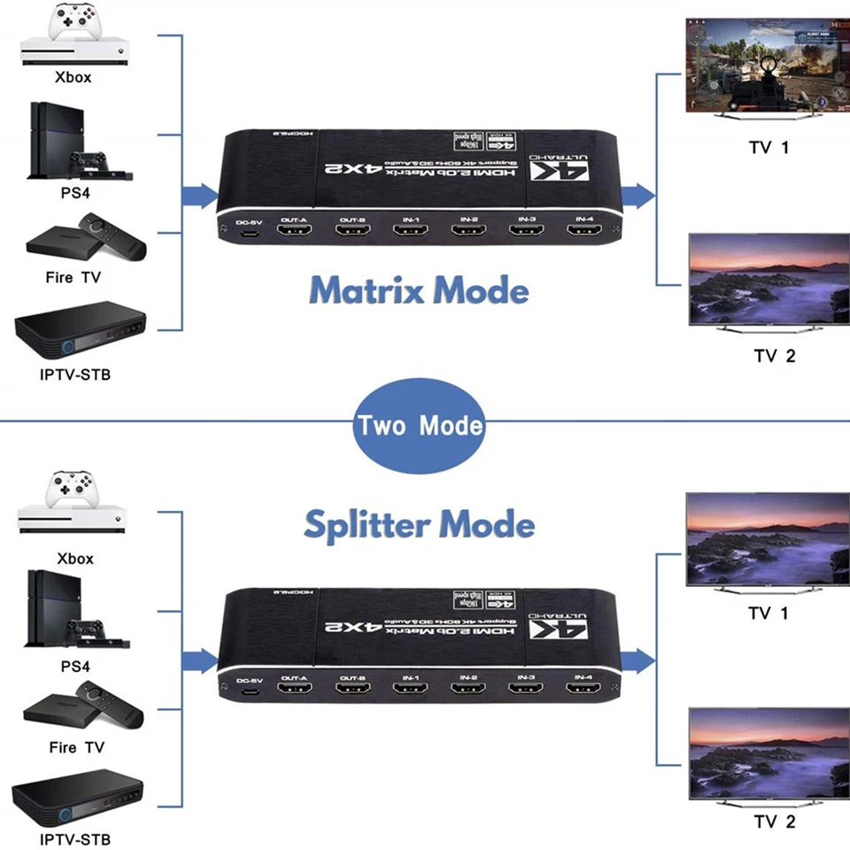 Матричный коммутатор 4x2 HDMI с 4 входами HDMI и 2 выходами HDMI. Это настоящая матрица и может распределить любой из 4 источников на любой из 2 дисплеев, и может работать как сплиттер, чтобы показать тот же источник на 2 дисплеях одновременно. Поддерживает разрешение входного и выходного сигнала до 4K x 2K/60HZ