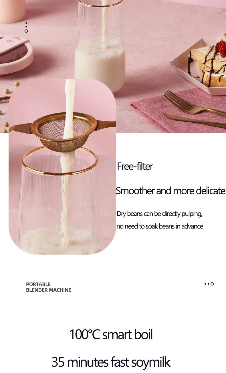 Особенности: 1. Многофункциональная, соевое молоко, рисовая паста, вареная вода, отпариватель, перемешивание, назначение. 2,304 нержавеющий вкладыш, пищевой материал 3,4-стальное лезвие ножа, складная ручка 4. Высокая скорость, 30000 об/мин, низкий уровень шума 5,600 мл емкость. Подходит для 1-2 человек