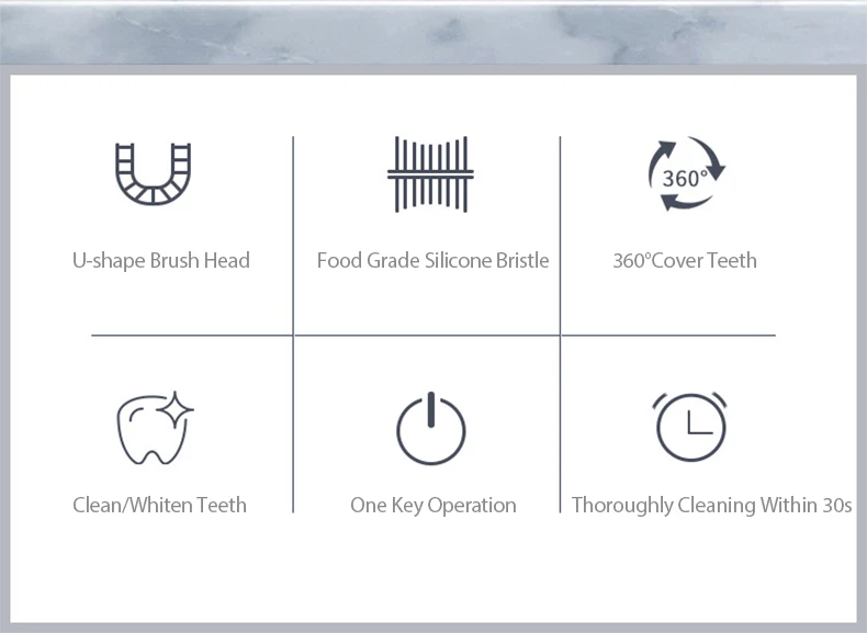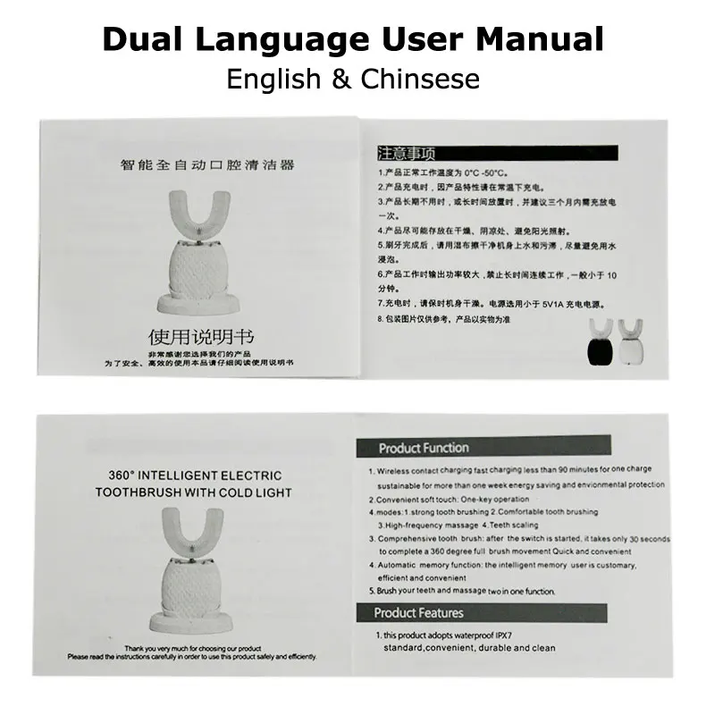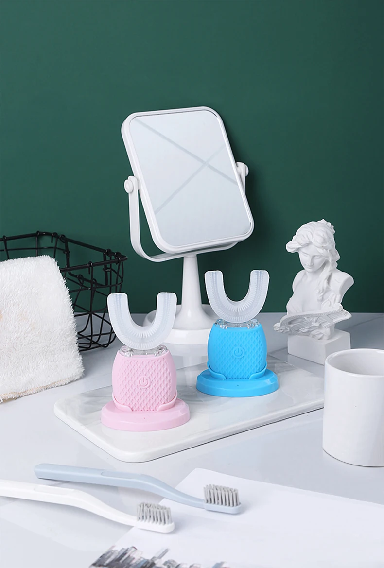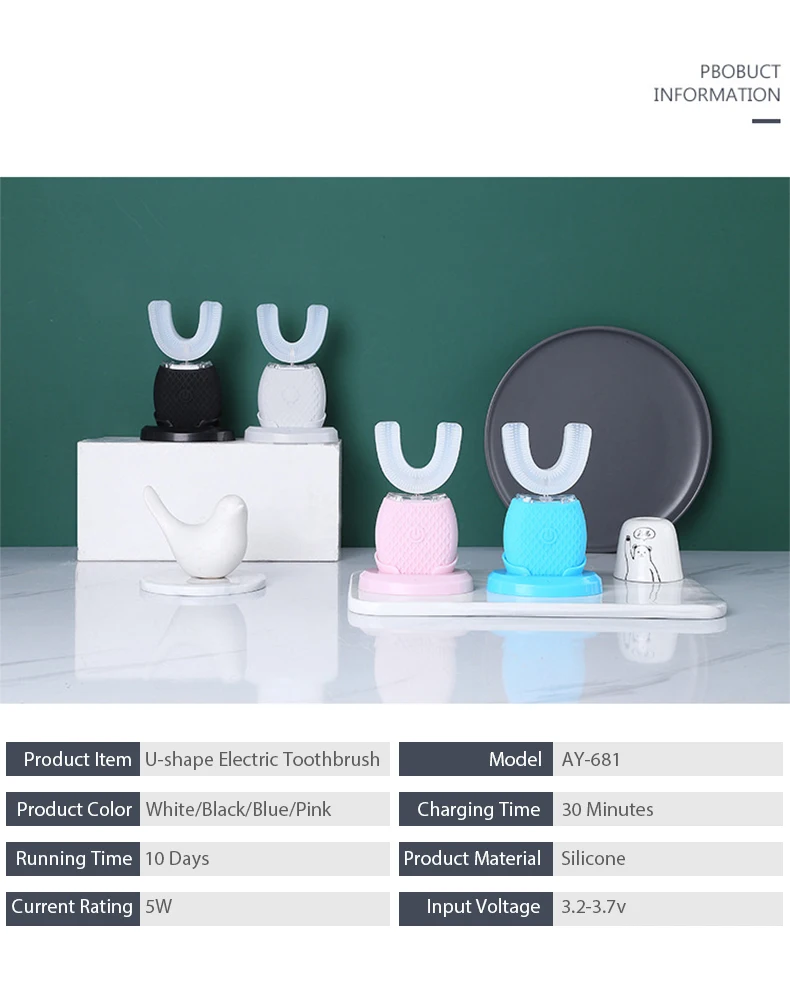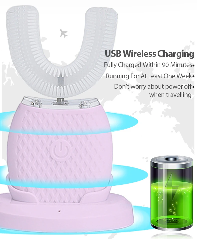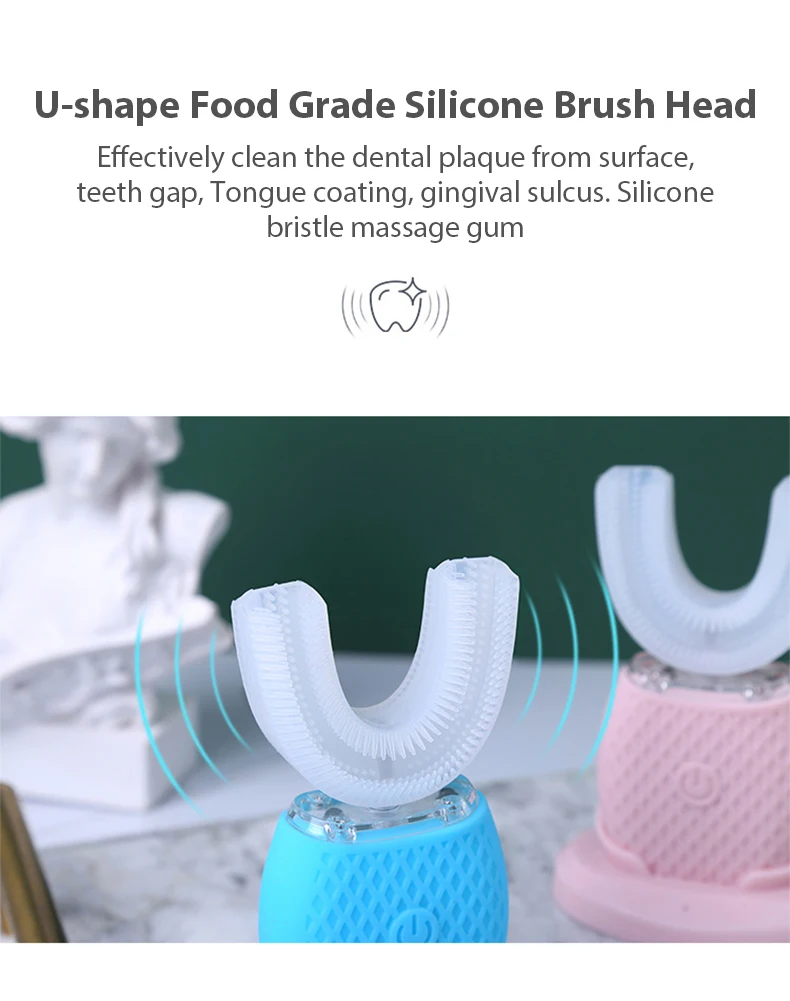 Электрическая зубная щетка u-образная автоматическая зубная щетка 360 градусов с крышкой зубная Беспроводная зарядка IPX7 Водонепроницаемая Массажная зубная щеткаОписание:360 ° крышка зубов, закончить тщательную очистку в течение 35s, сэкономить время.Силиконовая головка щетки, защищает ваши зубы от грубой чистки и массажной резинки.Полностью подходит для зубов, эффективно очищает зубной налет от поверхности зубов и зазора зубов.Синий холодный светильник отбеливает зубы, восстанавливает вашу уверенность.4 режима, мягкая чистка, сильная Чистка, массаж, синий светильник для отбеливания.Беспроводная зарядка с помощью usb-зарядного устройства, легко и удобно для нас.Полный корпус водонепроницаемый, Безопасный в использовании.