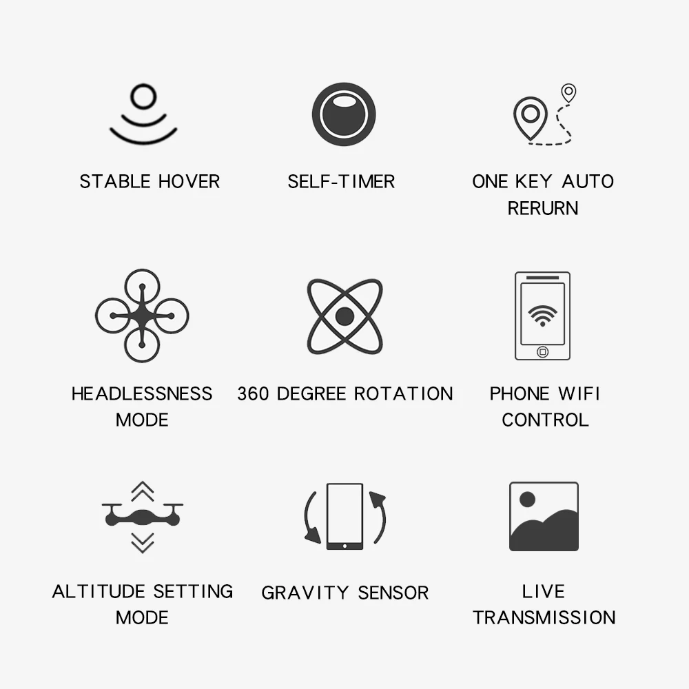 Функция: видео, фотосъемка, поднятие, спуск, движение вперед, движение задним ходом, поворот влево, вправо, полет влево, вправо, парение, вращение на 360 градусов, установка высоты