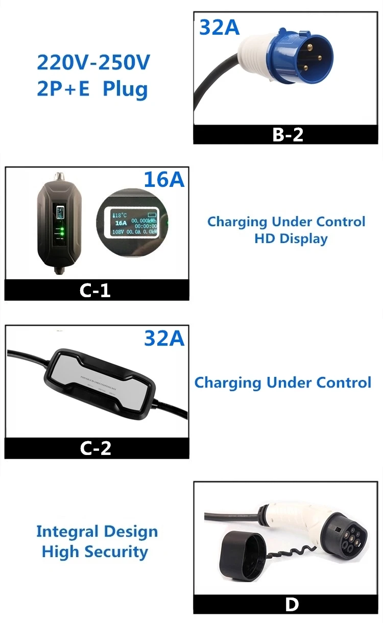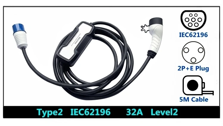 Информация о продукте: • Модель: Тип 2 IEC62196-2 • Изделие: портативное зарядное устройство EV • Ток зарядки: 16A / 32A • Входное напряжение: однофазный 220-250 В • Рабочая температура: -30 °C ~ + 50 °C