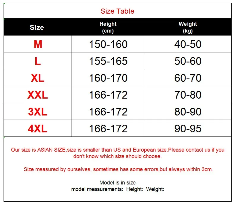 1. Наш размер азиатский, размер меньше, чем американский и европейский. Пожалуйста, свяжитесь с нами, если вы не знаете, какой размер выбрать. Размер, измеренный нами, иногда имеет некоторые ошибки, но всегда в пределах 3 см. 2. Если у вас есть какие-либо другие вопросы, пожалуйста, свяжитесь с нами. 3. Советы: отображение различных компьютеров или мобильных телефонов отличается, пожалуйста, обратитесь к фактическому продукту.