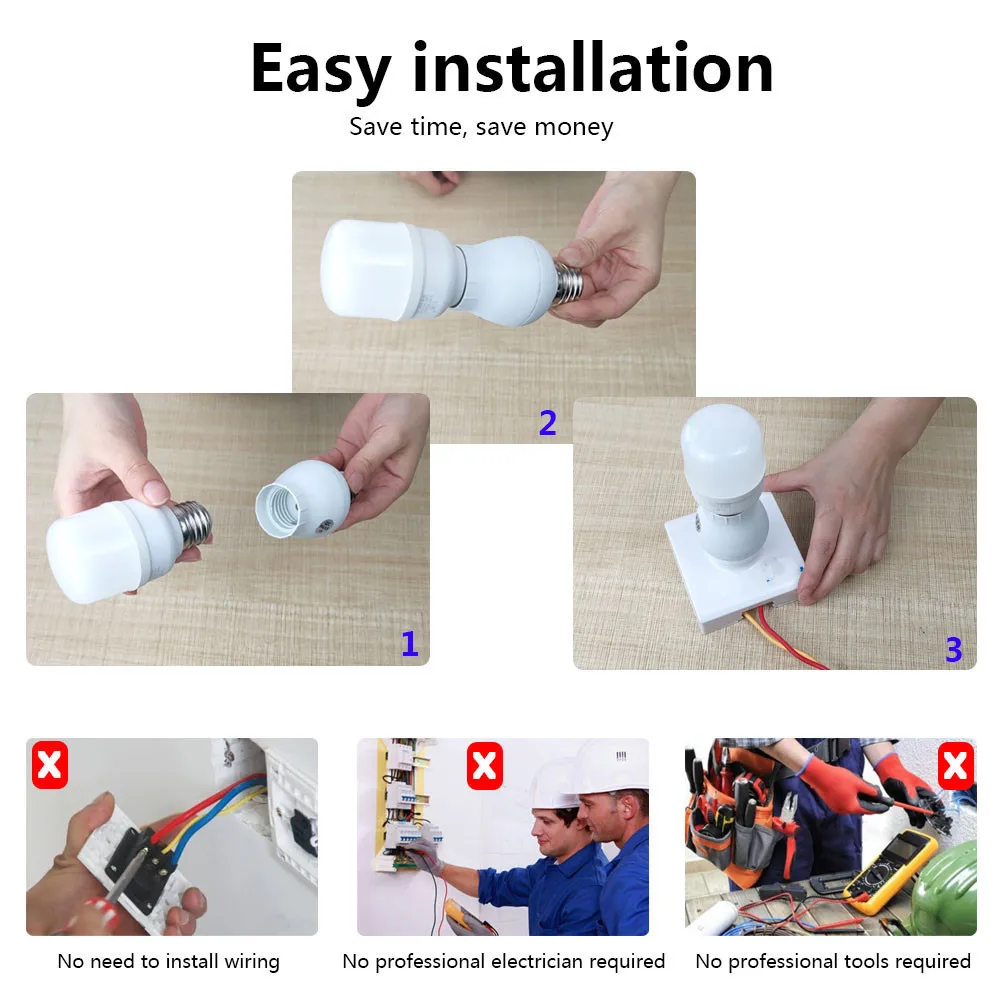 1. Подходит для ламп E26 / E27 2. Сертификация CE, FCC, ROHS: 100% проверка перед транспортировкой для обеспечения безопасности продукта 3. Высокочувствительный дизайн, дизайн ящика, светящаяся флуоресцентная полоса, конструкция сопротивления падению, большая панель и т. д. 4. Уникальная форма головки лампы, красивая изгиб