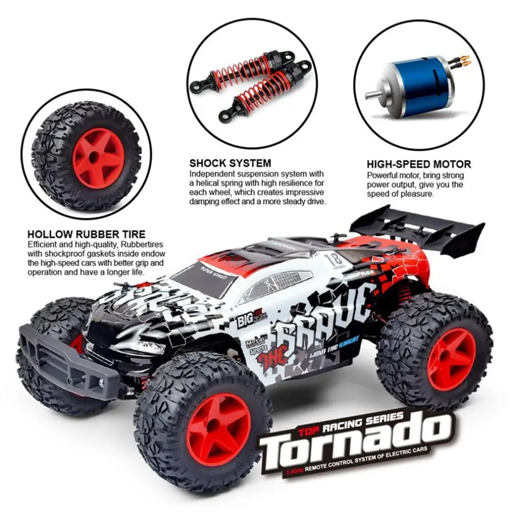 -Поддержка радиоуправляемого передатчика 2,4 ГГц, четырехколесная независимая система подвески, управляющая все время.