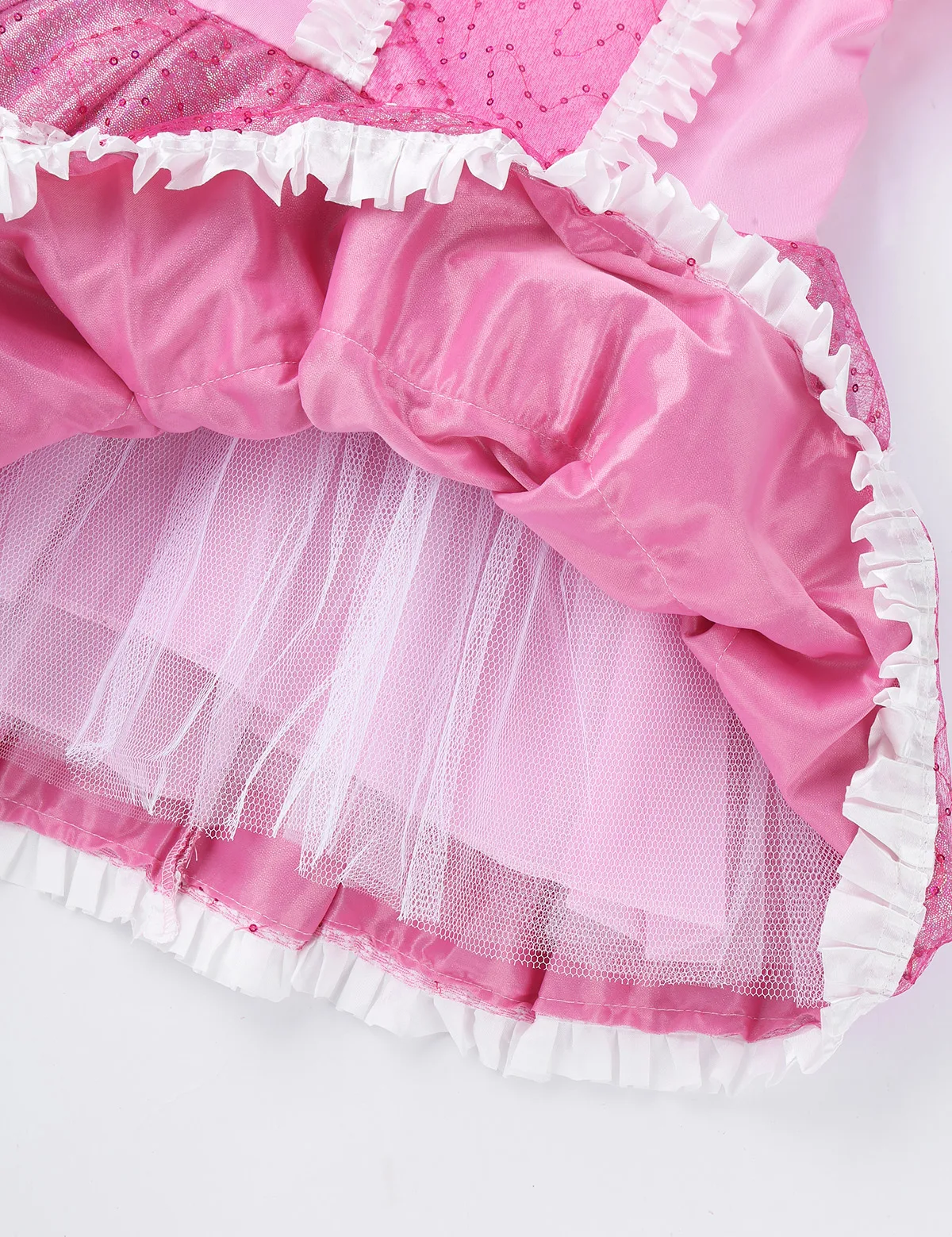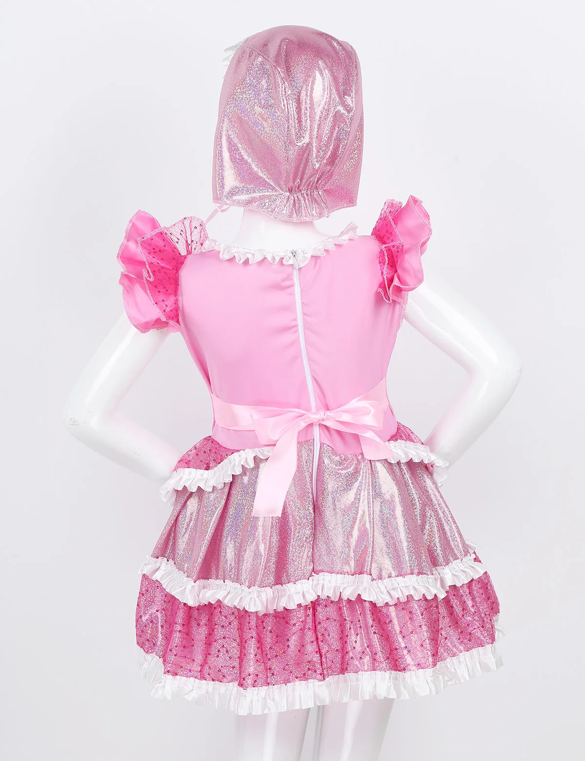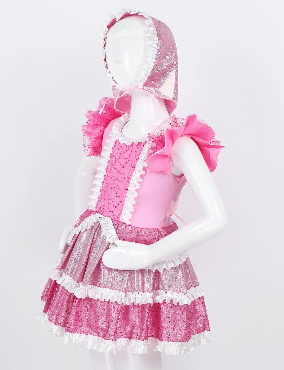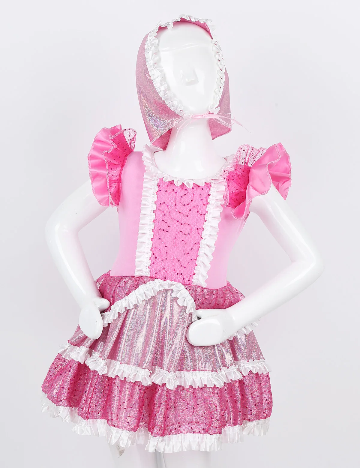 4 слоя платье, модный топ, блестящие атласные многослойные с кружевными оборками и Сетчатое платье с блестками, 1 слой сетки, 1 слой сетки, 1 слоя подкладочной ткани. Сочетающаяся блестящая шапочка с ленточными завязками. Милый и очаровательный танцевальный костюм для вашей девочки.