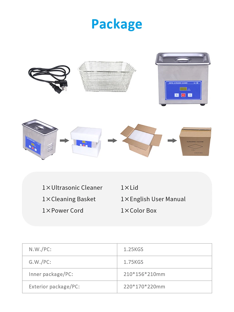 Емкость: 0.6L Частота: 40 кГц Сверхзвуковая мощь: 50 Вт Цифровой таймер управления (180S/360S) Материал: SUS304 Внутренний бак: 150*85*65 мм Единица измерения: 175*110*155 мм Внутренняя упаковка: 210*156*210 мм Внешняя упаковка: 450*355*450 мм Cube/коробка: 0.08m3 Кол-во в коробке: 8 шт. G.W./коробка: 13.5kgs