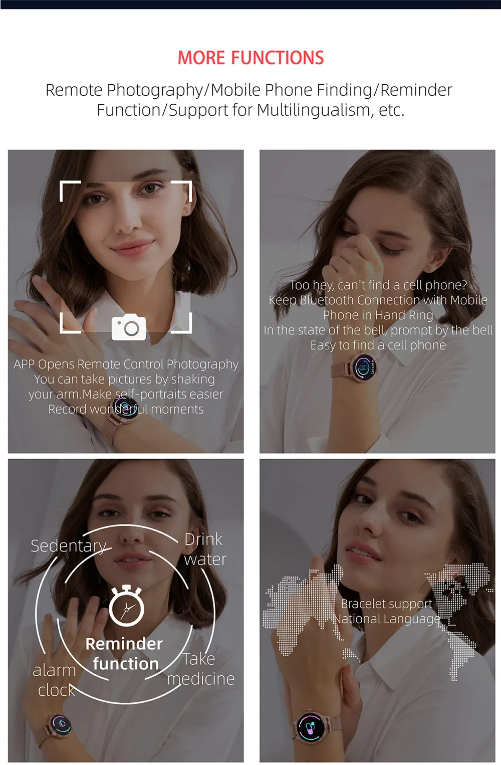 Спортивный шаг, спортивные калории, обмен здоровьем (отправка через приложение), Настройка спортивных целей, обнаружение сердечного ритма в реальном времени, обнаружение артериального давления в реальном времени, мониторинг кислорода в крови. Напоминание о сне, напоминание о сидячем положении и напоминание о тревоге. Низкомощный чип, здоровый спортивный стиль,