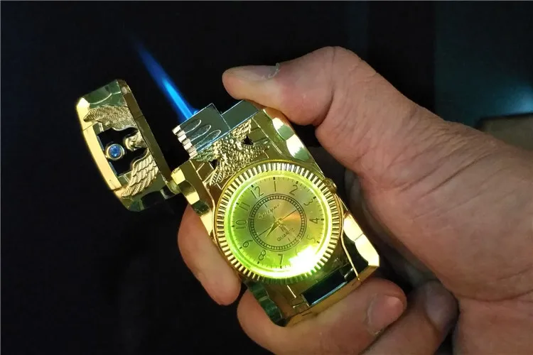 Роскошная реактивфонарь жигалка золотые часы турбо газовая ветрозащитная Зажигалка сигареты металлическая светодиодсветодиодный Зажигалка надутый бензиновый Бутан