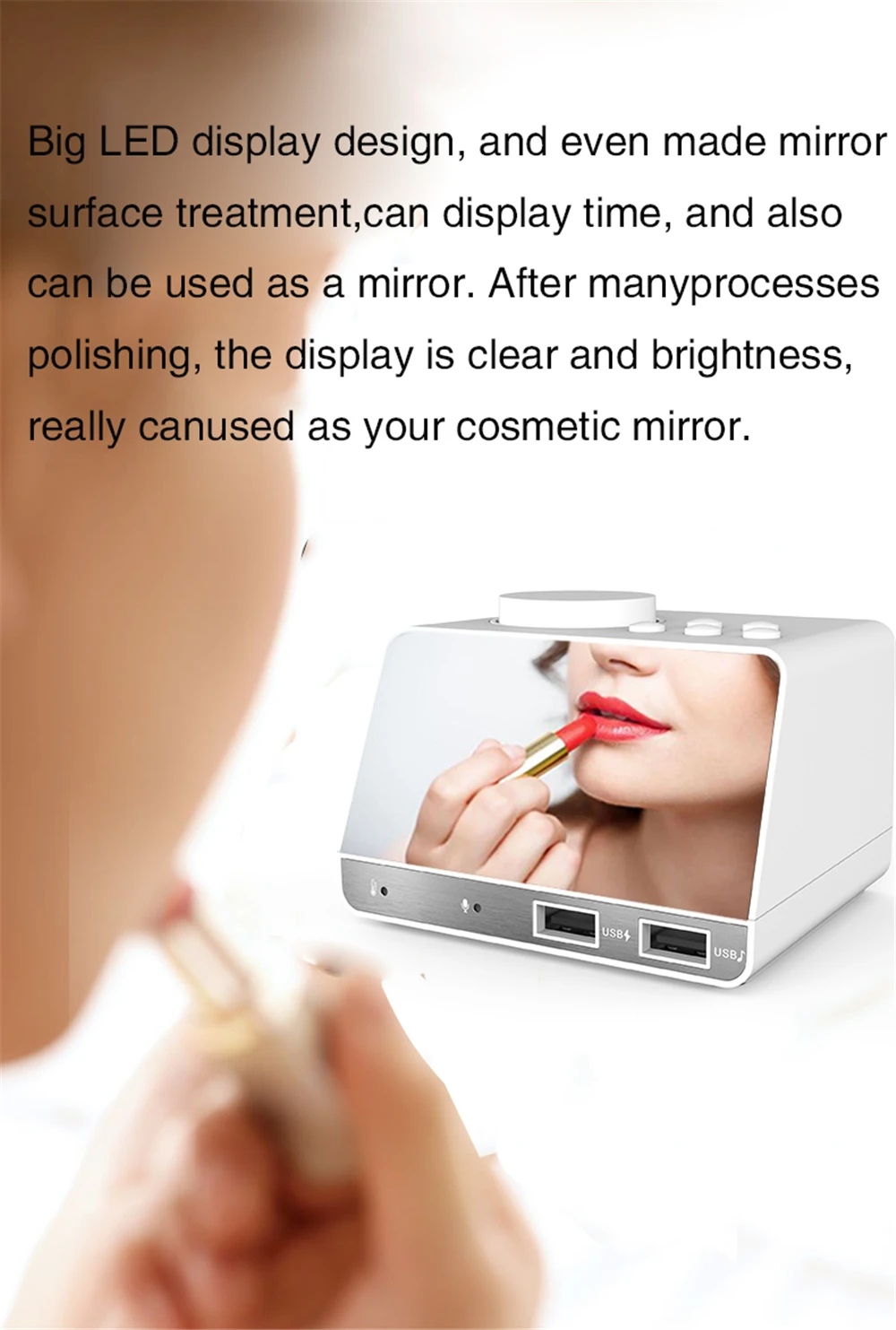 Есть 2 usb-интерфейса для зарядки ваших электронных устройств с питанием от USB, таких как мобильный телефон, планшет и так далее. И вы можете вставить u-диск во второй usb-порт для воспроизведения песен, которые вам нравятся.