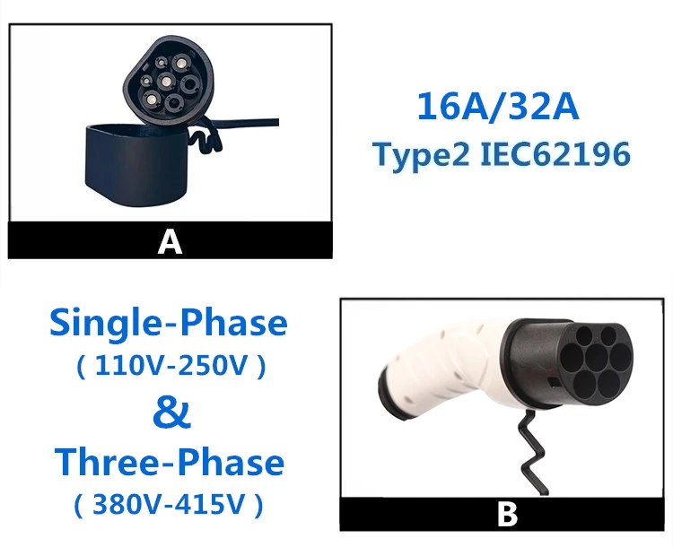 Информация о продукте: • Модель: Тип 2 IEC62196-2 • Изделие: Тип 2-Тип 2 • Ток зарядки: 16A / 32A • Входное напряжение 1: одиночная фаза 110-250 В • Входное напряжение 2: трехфазный 380-415 В • Рабочая температура: -30 °C ~ + 50 °C