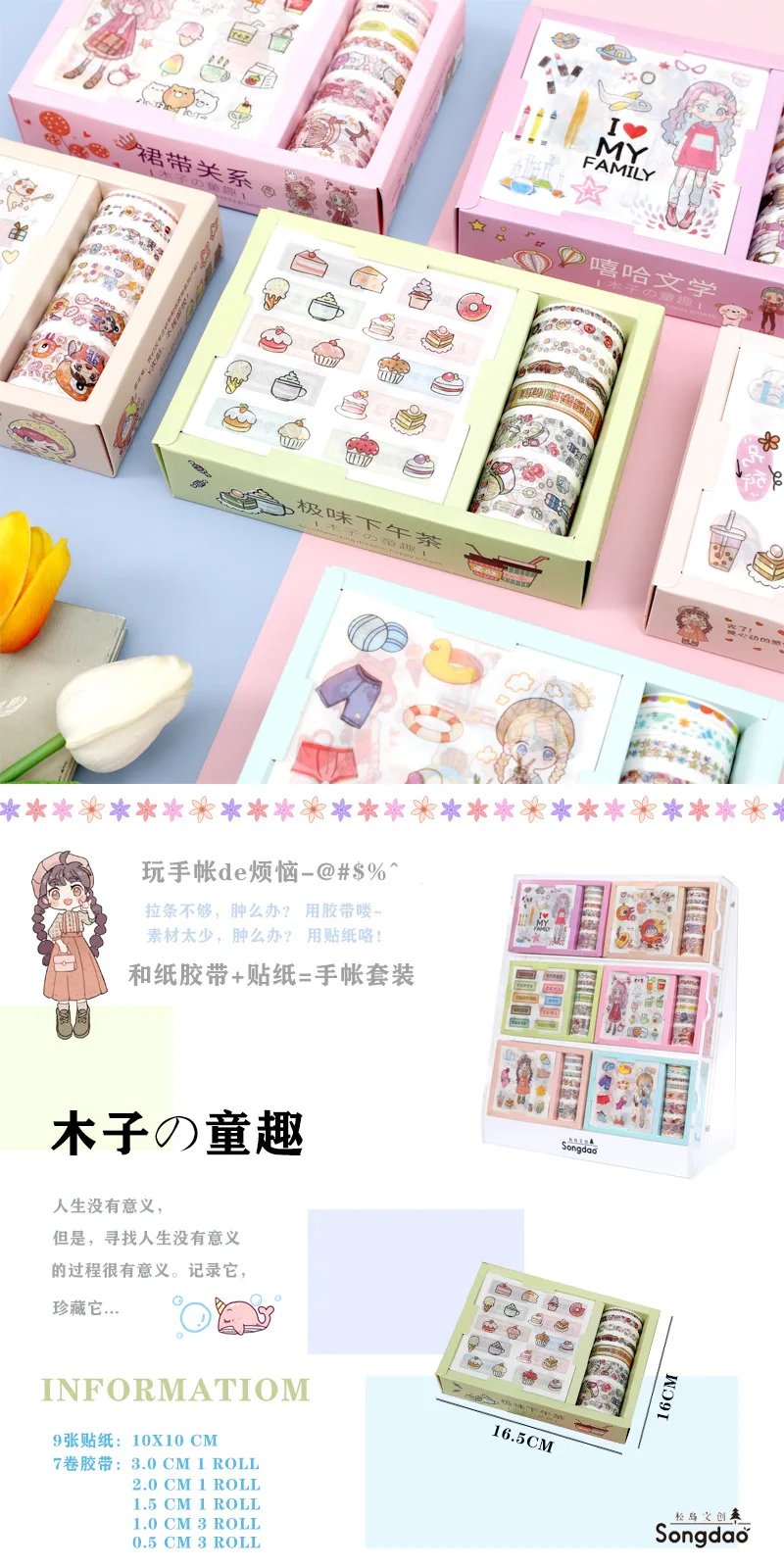 Набор включает в себя Стикер бумаги 9 штук Размер: 10*10 см Ленты: 7 шт. 3,0 см 1 рулон 2,0 см 1 рулон 1,5 см 1 рулон 1,0 см 2 рулона 0,5 см 2 рулона