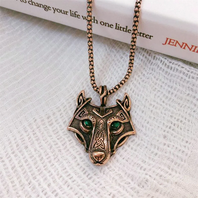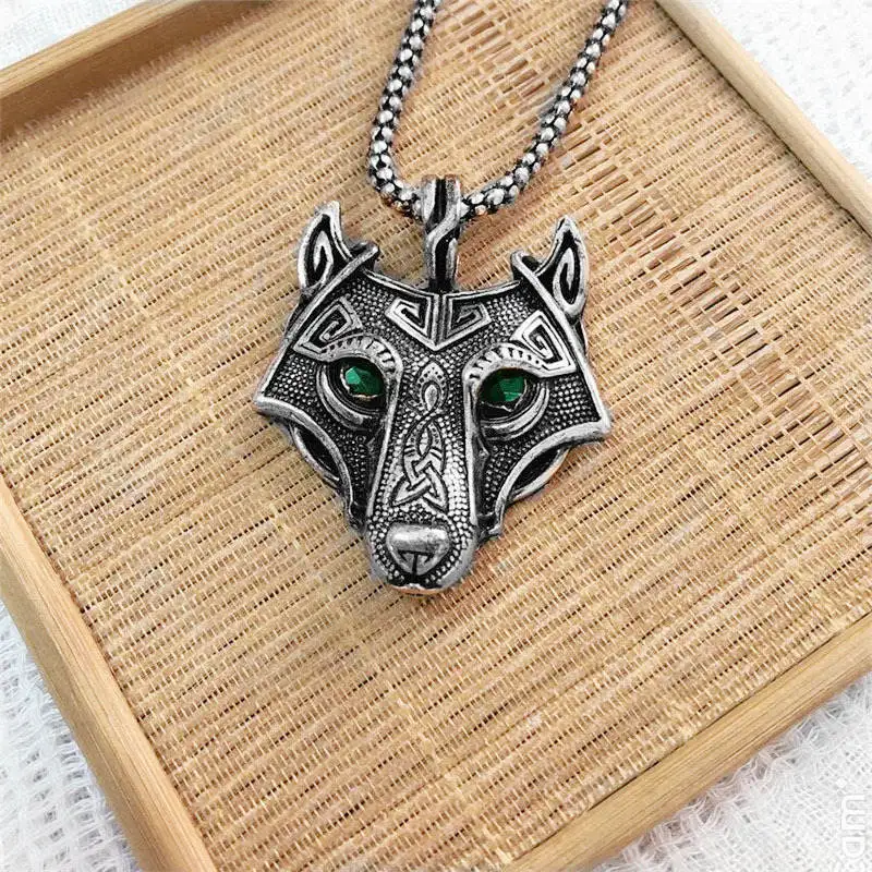 Винтажное ювелирное ожерелье с подвеской в стиле норвежских викингов, ожерелье с головой скандинавского волка, оригинальное ювелирное изделие в виде животного, красный, зеленый, Хрустальный глаз, голова волка