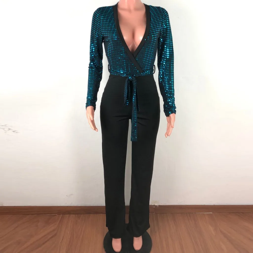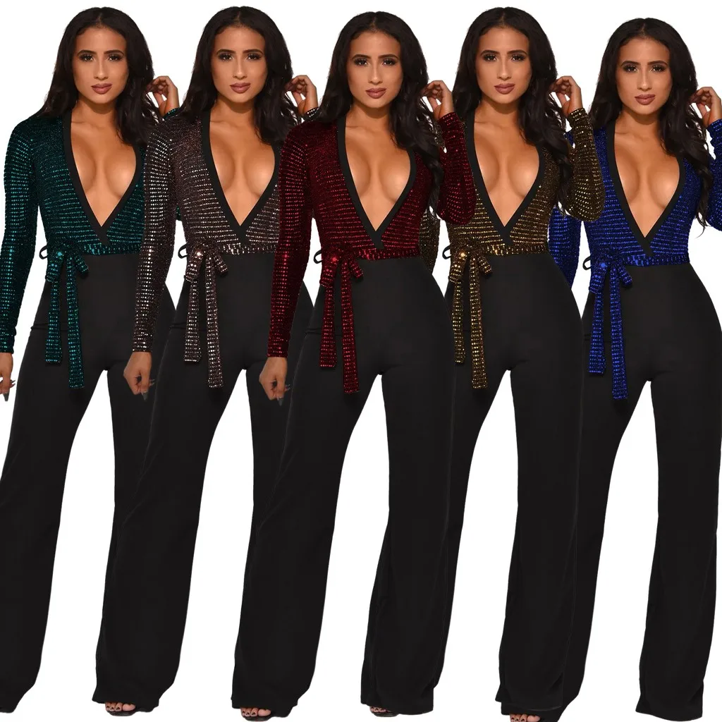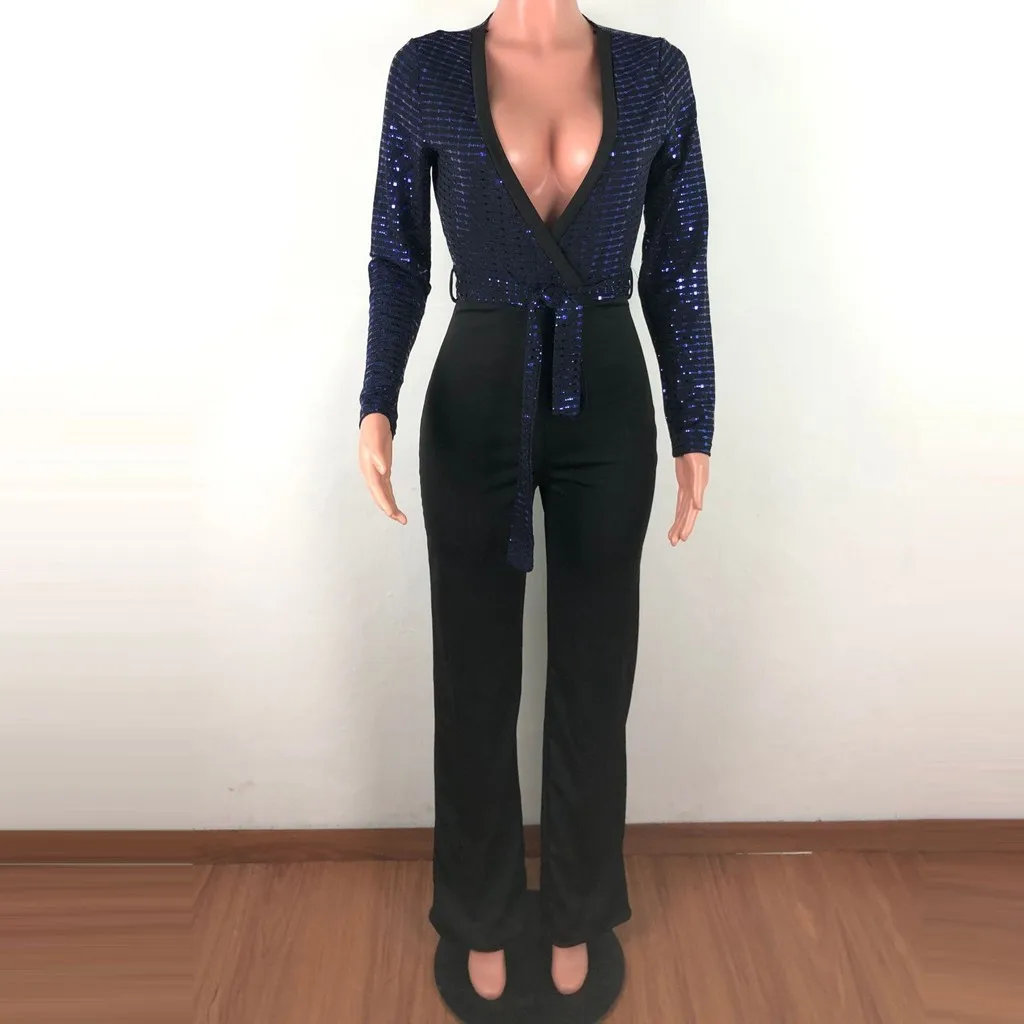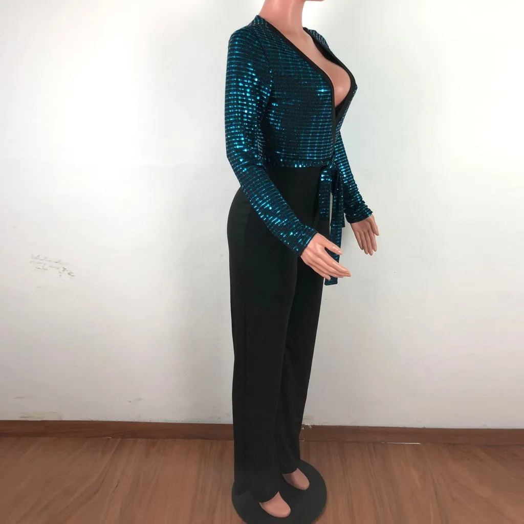 Sequined Slim Women Jumpsuits Black Sexy Solid Leotard Long Sleeves Straight Rompers Partywear Monos de Fiesta 2020 New YE