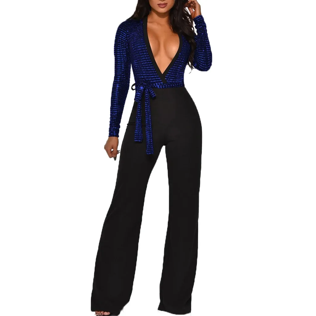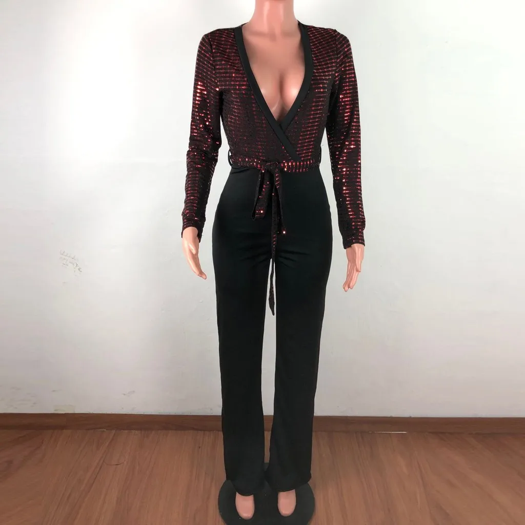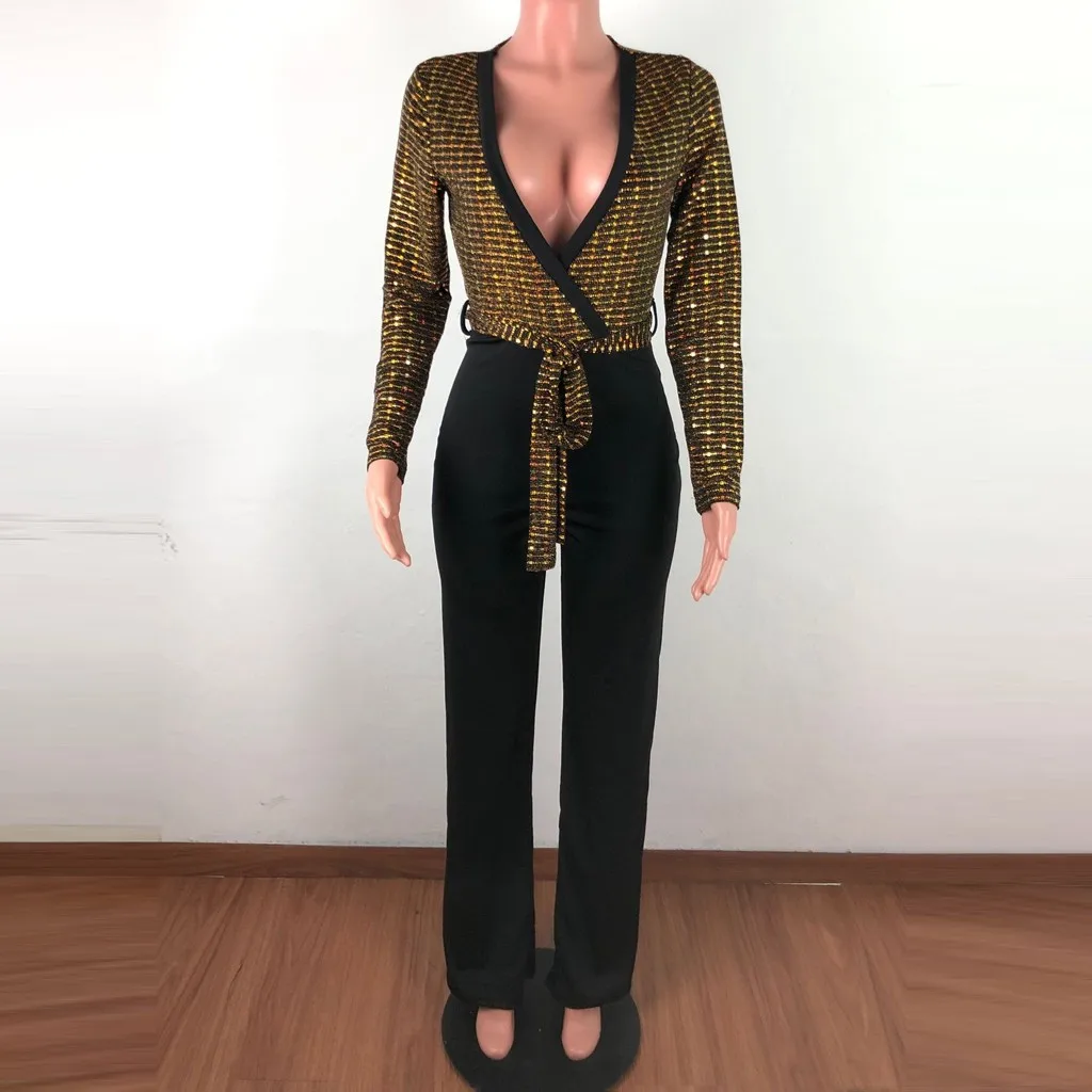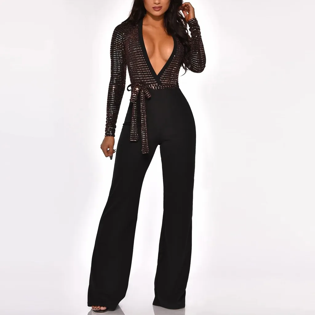 Sequined Slim Women Jumpsuits Black Sexy Solid Leotard Long Sleeves Straight Rompers Partywear Monos de Fiesta 2020 New YE