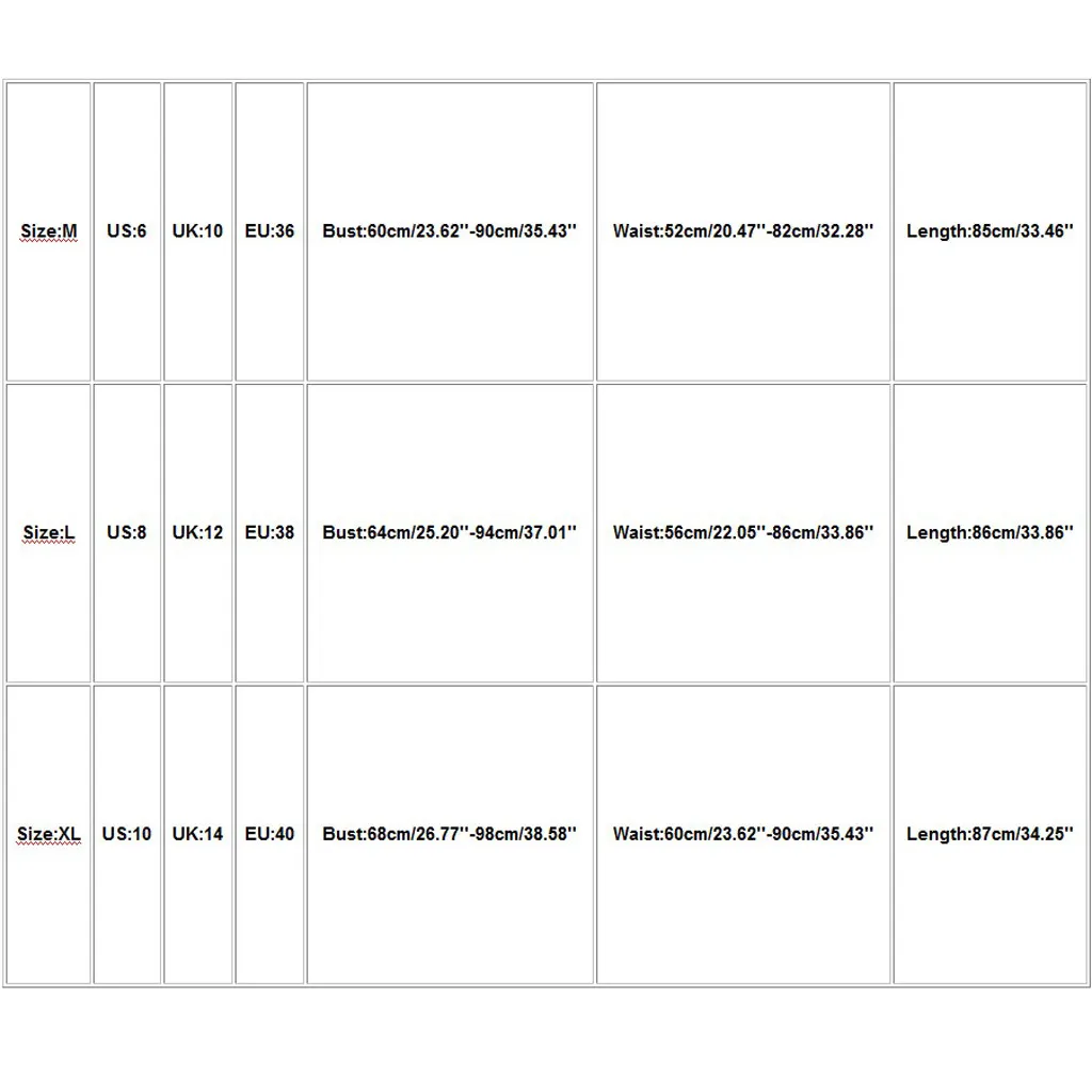 Что вы получаете: 1 шт. женское платьеРазмер Свяжитесь с нами Великобритания ЕС Обхват груди Обхват талии Длина М 6 10 36 60 см/23,62 "-90 см/35,43'' 52 см/20,47 "-82 см/32,28'' 85 см/33,46'' L 8 12 38 Высота голенища 64 см; 25,20 ''-94 см/37,01'' 56 см/22,05 ''-86 см/33,86'' 86 см/33,86'' XL 10 14 40 68 см/26,77 "-98 см/38,58'' 60 см/23,62 "-90 см/35,43'' 87 см/34,25''